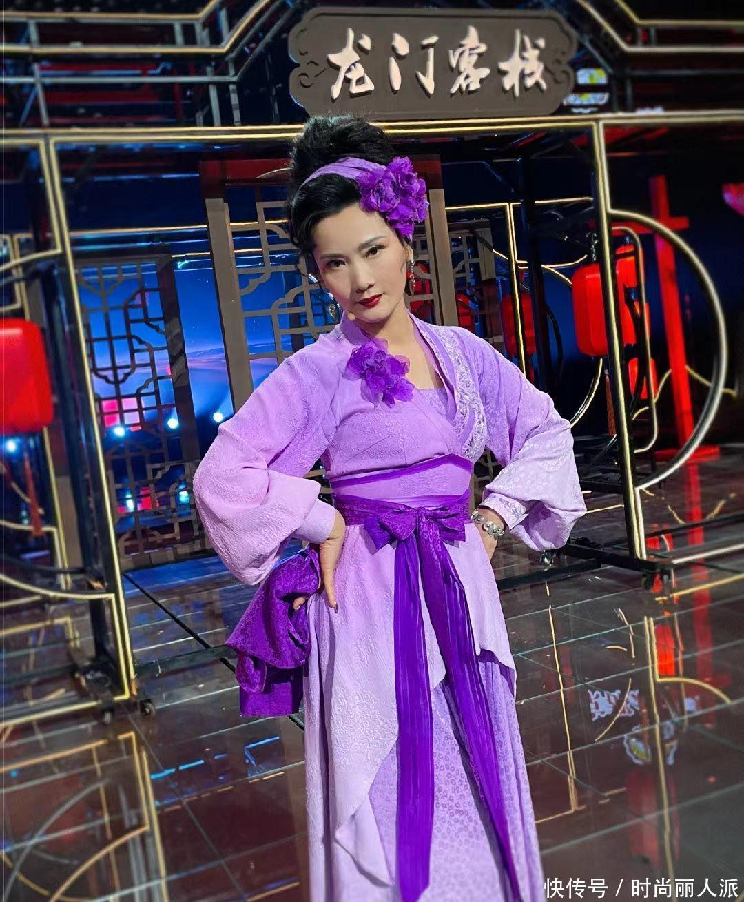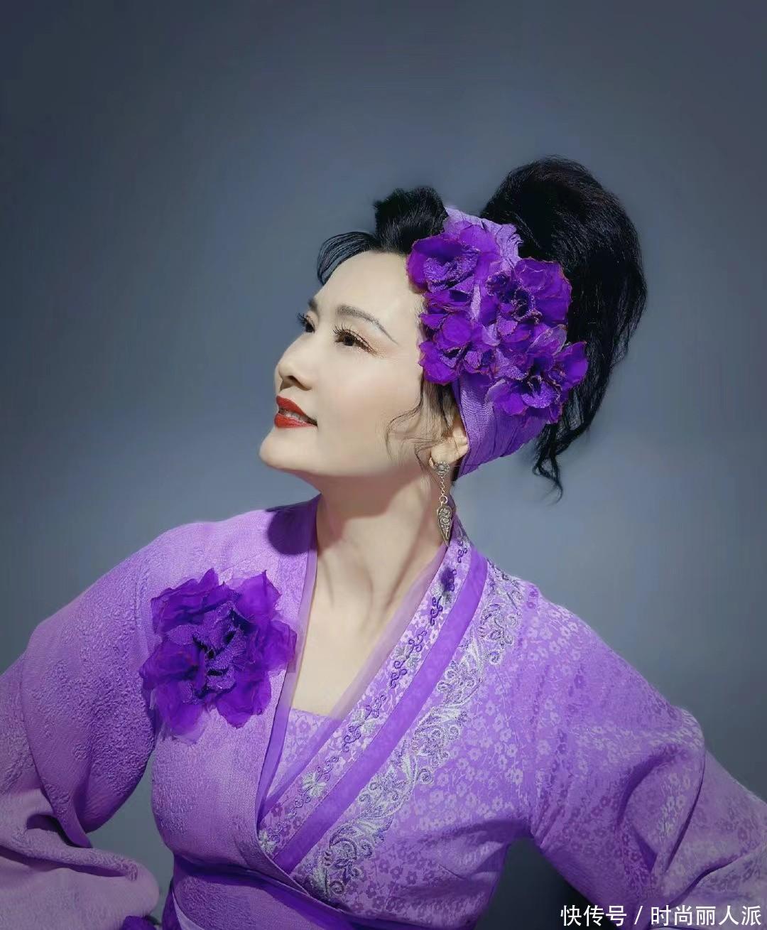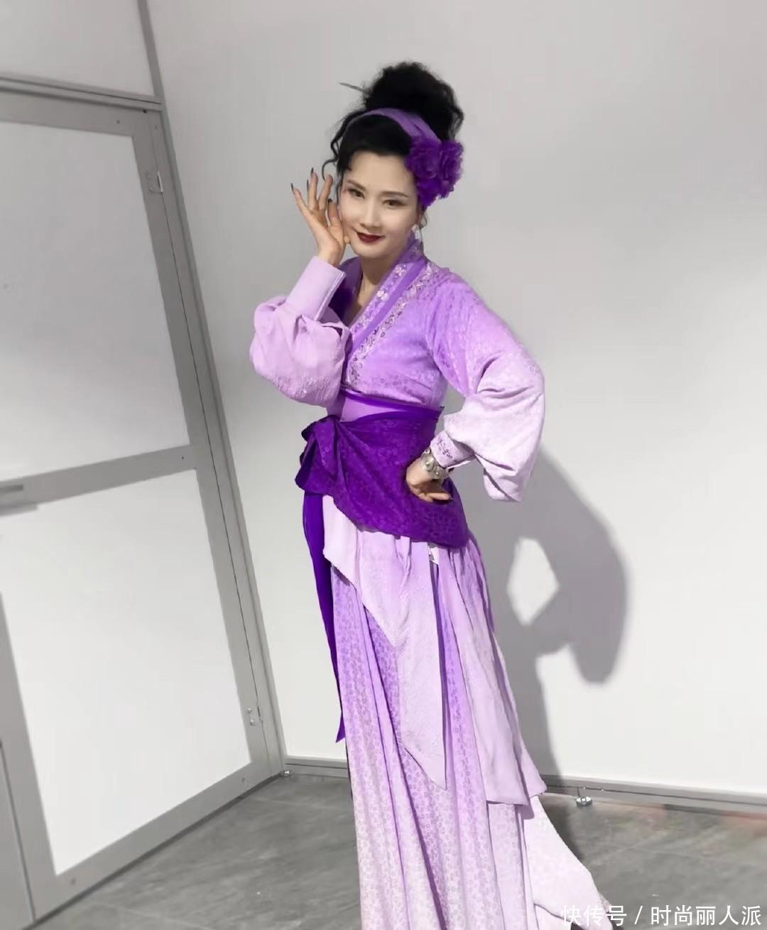 紫色的襦裙自带时代感,交叠着的领口露出何赛飞的脖颈曲线,依旧流畅的线条为她的气质添砖加瓦。在腰身处,何赛飞系了一条深紫色围裙,随意垂放着的丝带飘逸灵动,搭配裙身的层层叠叠,尽显女性的独特魅力。
