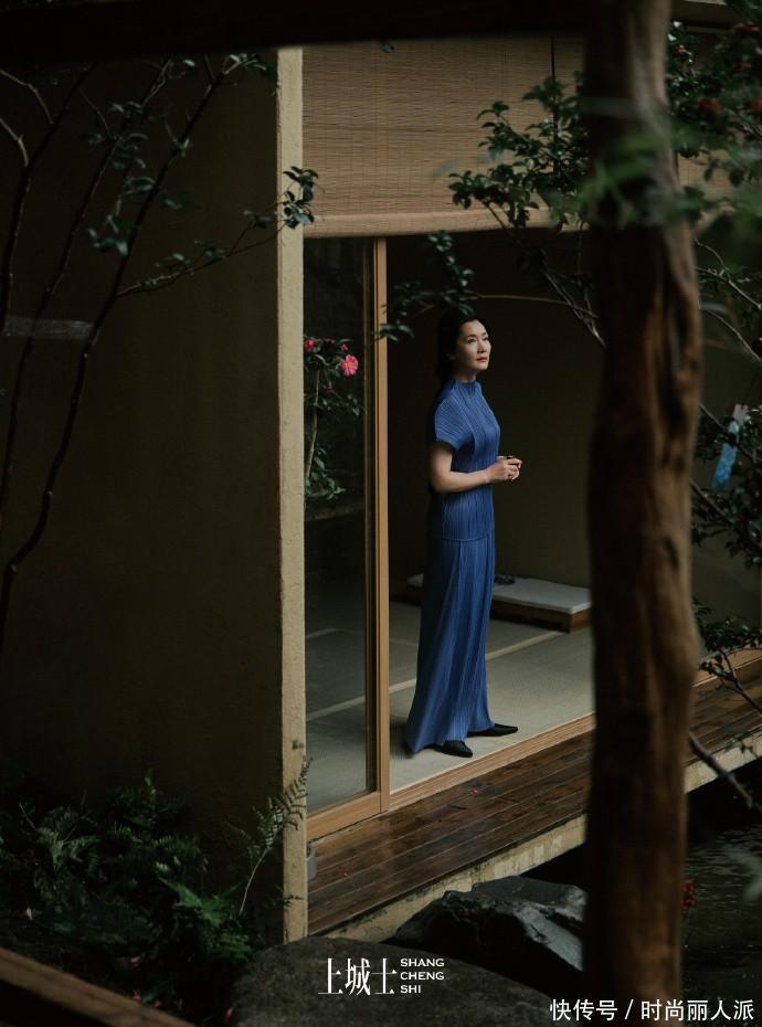 在提花外套的里面,何赛飞搭配了一件青花瓷上衣,与桌子上的花瓶很像,整个画面的效果和谐且统一。感觉何赛飞是典型的中国美人,举手投足之间都充满了古典的美,韵味十足。