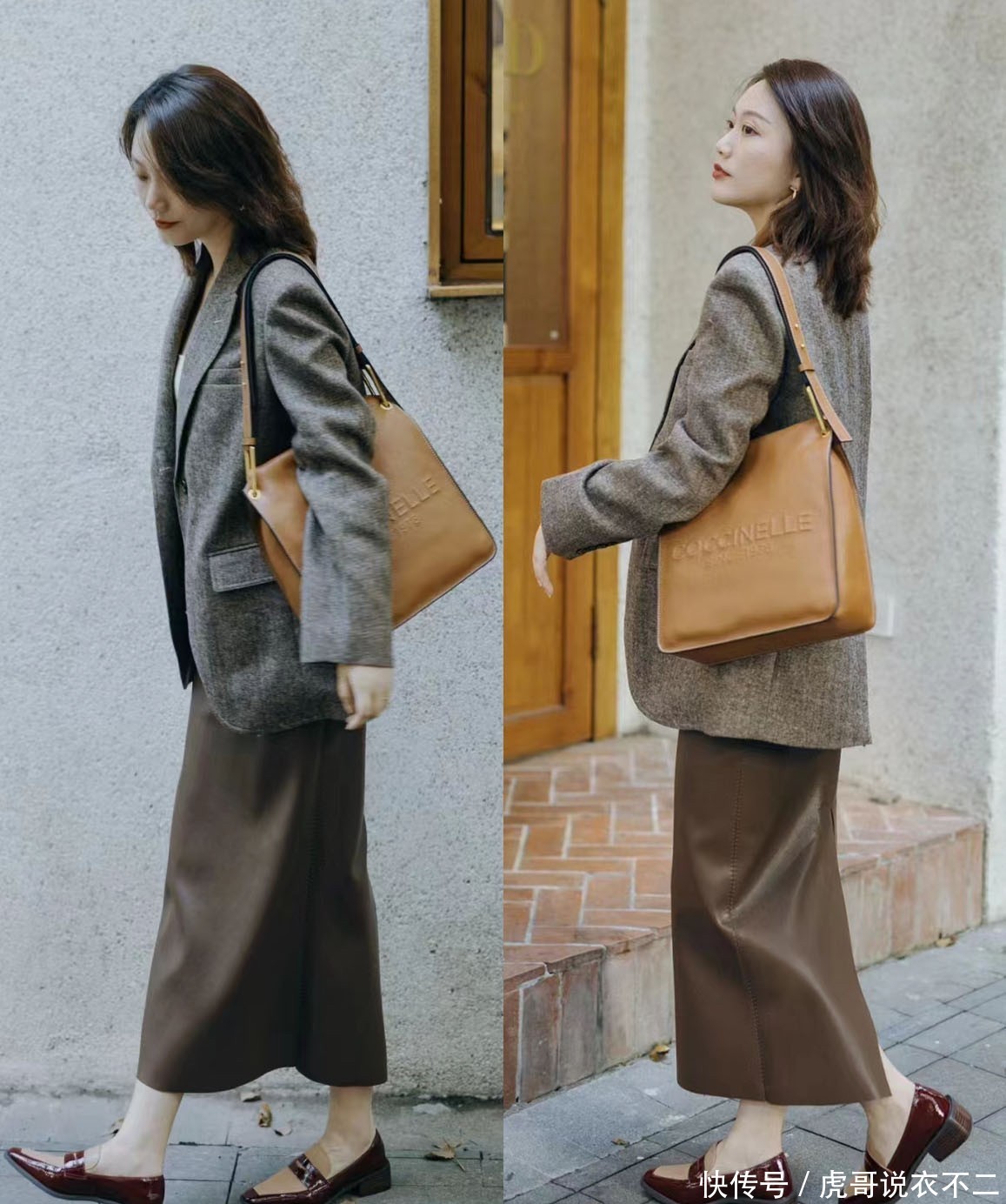像这件深褐色的皮裙,看起来有着酷飒的风格、与比较厚重的外观,用来烘托出又美又飒的气场,自然是没有什么问题的。上搭针织毛衣的话,可以借由两种单品截然不同的材质,轻松形成层次分明的叠穿感,优雅又摩登。