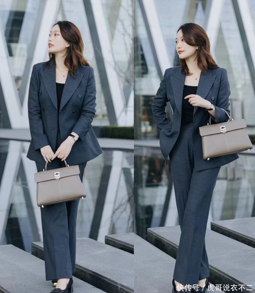 上图这身同色系穿搭就是很好的例子,深灰色的小西装与西裤,将职场风采展现的淋漓尽致,令上班族女性穿出了干练大气的一面。