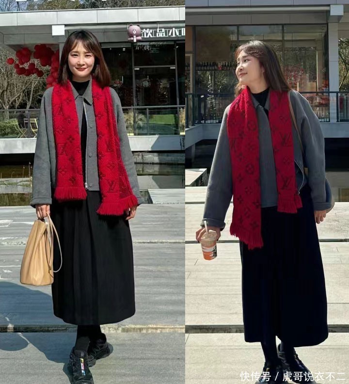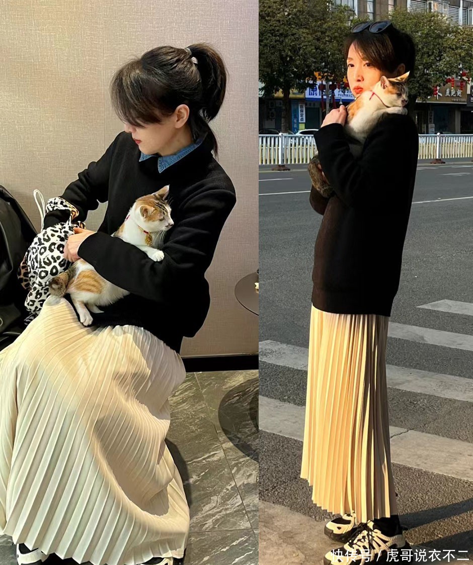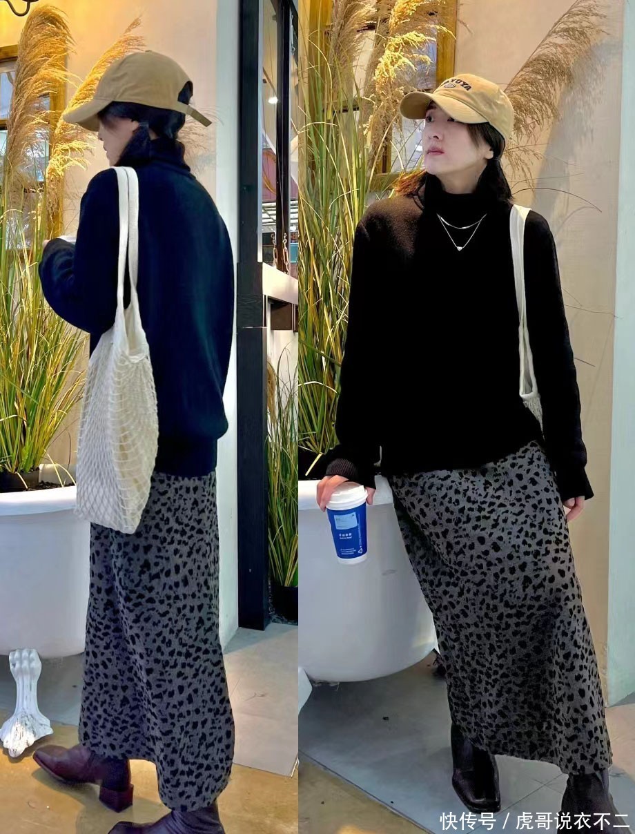 比如说图中这件半身裙,长裙设计通过对腿部的全面覆盖,自然可以轻松修饰自身存在的大部分不足之处,配合着皮靴,更彰显出了高级质感。