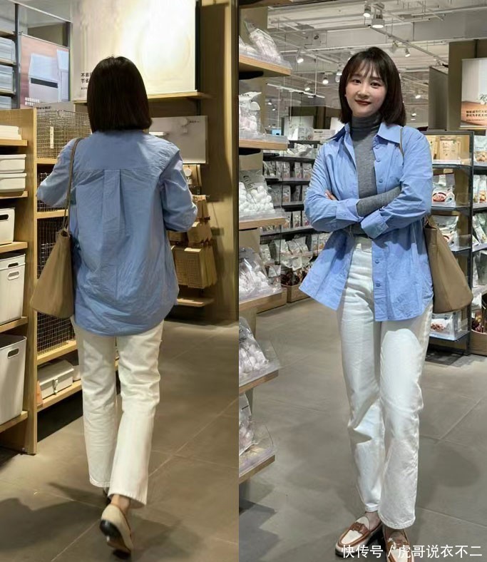 但是在早春的话,相信大部分女人并不会直接运用衬衫作为上装,太过轻薄、无法应付春季忽冷忽暖的温度。因此上图这位博主,就将其与高领打底衫配合,简单的塑造出了叠穿感,比较保暖也不拉档次。