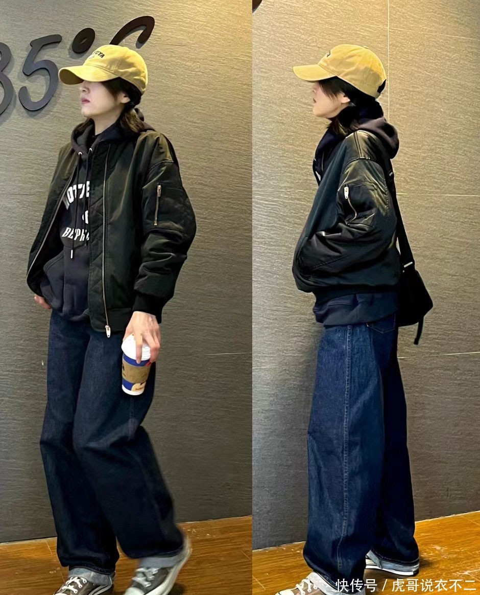 比方说上图这位女士的穿搭主打帅气风,但配色太过深沉的话,就容易彰显出沉闷的既视感,但正是因为有着牛仔裤的搭配,在造型中注入了几分休闲感与轻快的气息。
