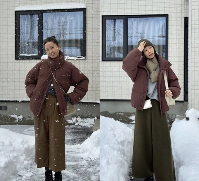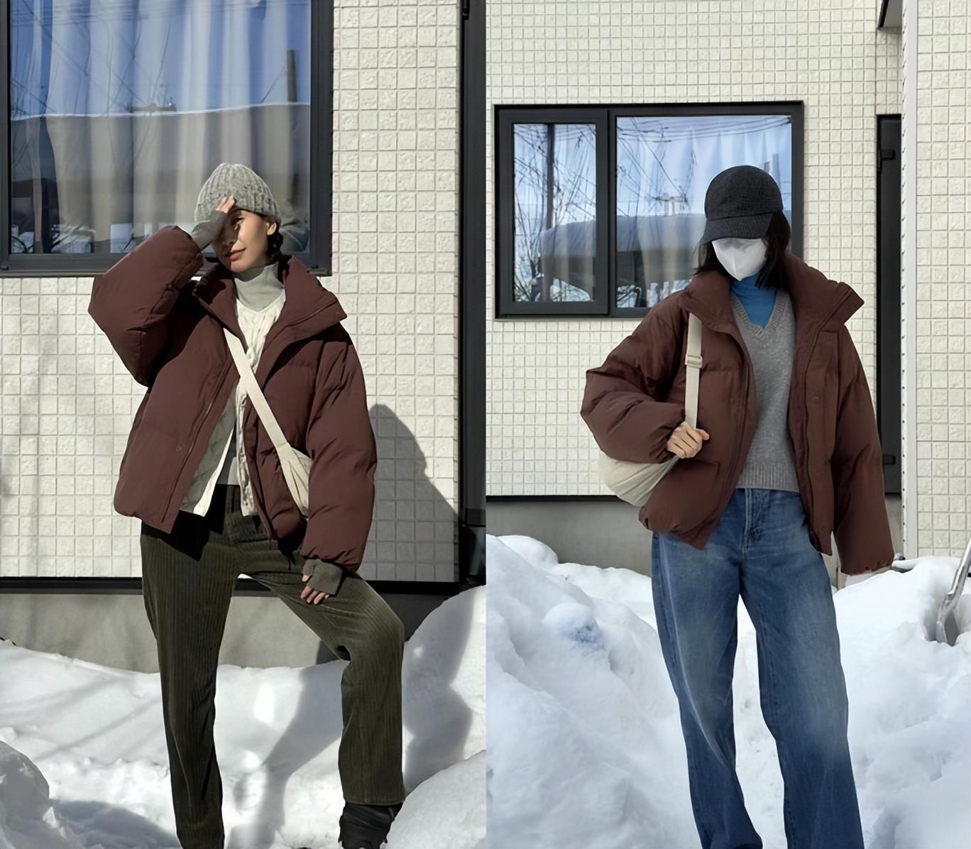 比如这两件短款羽绒服,都搭配了长裙,而显得姿态更加的优雅,与此同时,覆盖了腿型,显瘦效果是绝对明显的。
