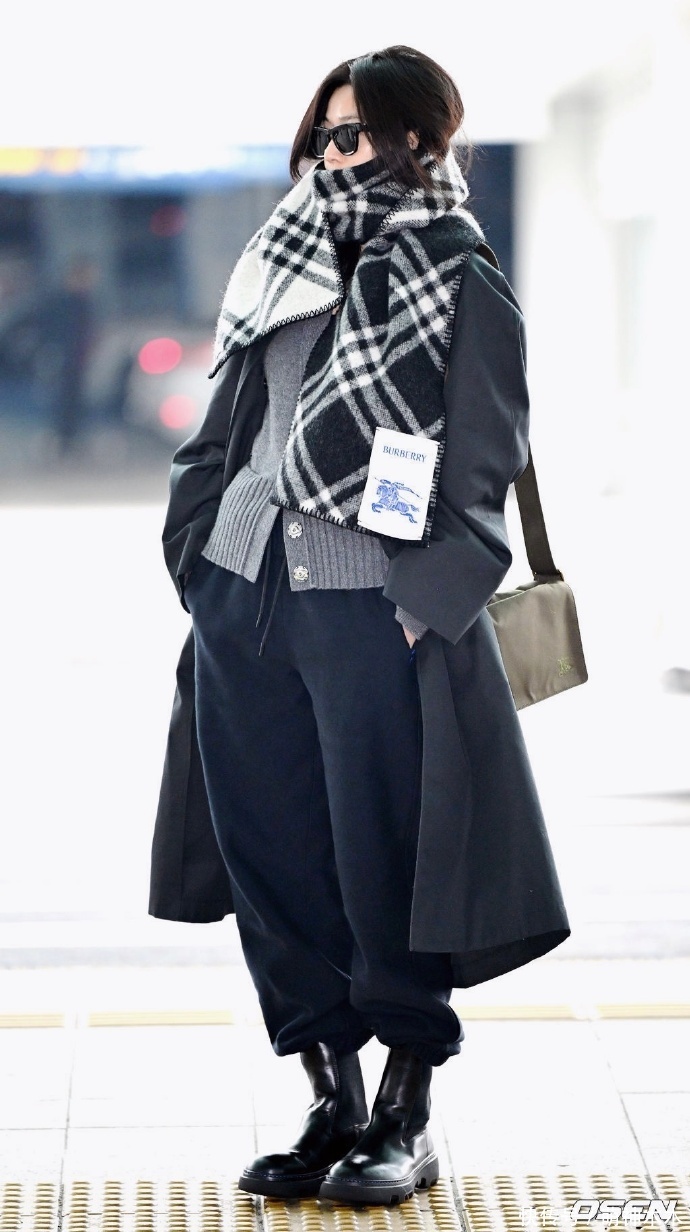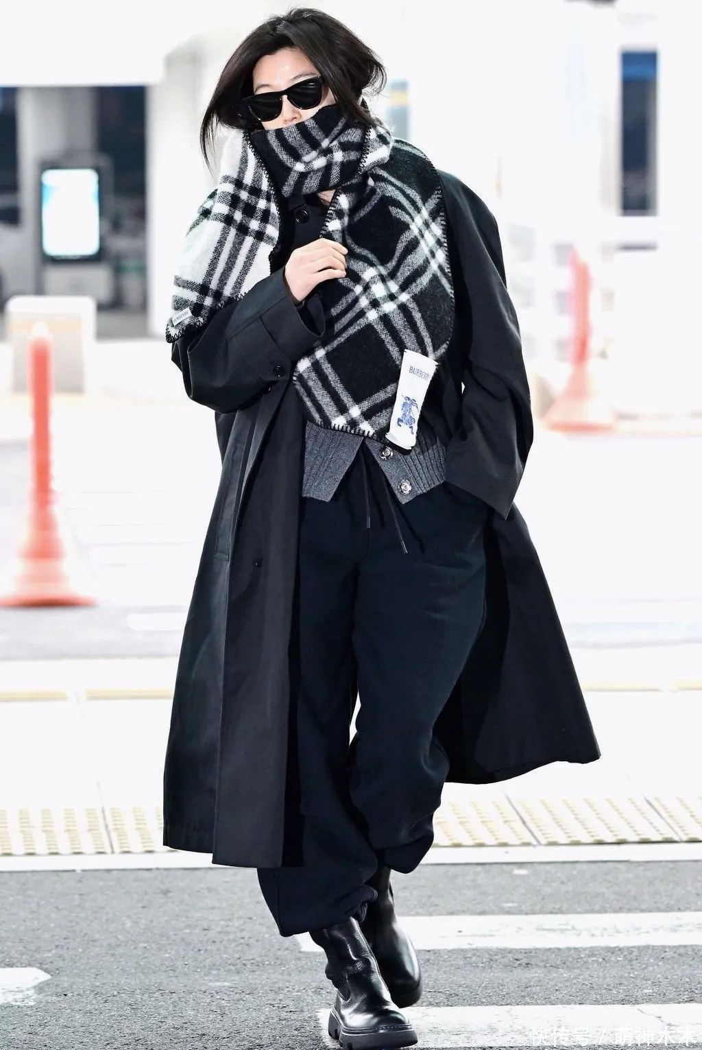 巧合的是,就在同一日,韩国女星全智贤也从机场出发,准备前往伦敦时装周。从现场照来看,全智贤的穿搭充分彰显个人风格,一身宽松版风衣,内搭灰色对襟针织衫,下面搭配深色系休闲长裤,还有一款黑白围脖。