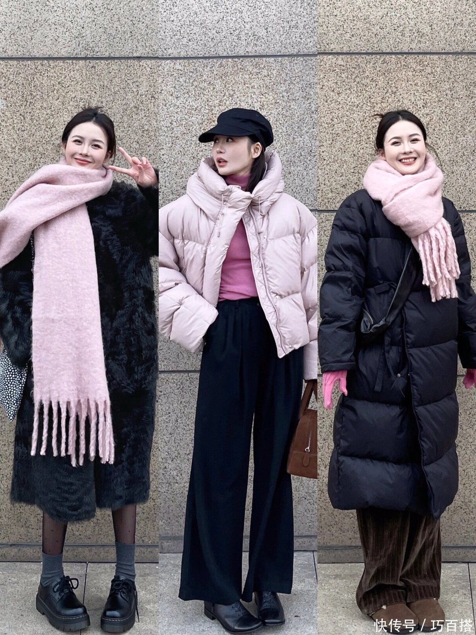 如果你选择纯黑造型,可以像博主刚才一样搭配粉色围巾或者直接借鉴这三种模式,在大面积黑色调的加持下,30+女性可以选择卡其色半裙和手提包,也可以直接选择内搭纯白色圆领打底衫和卡其色雪地棉。
