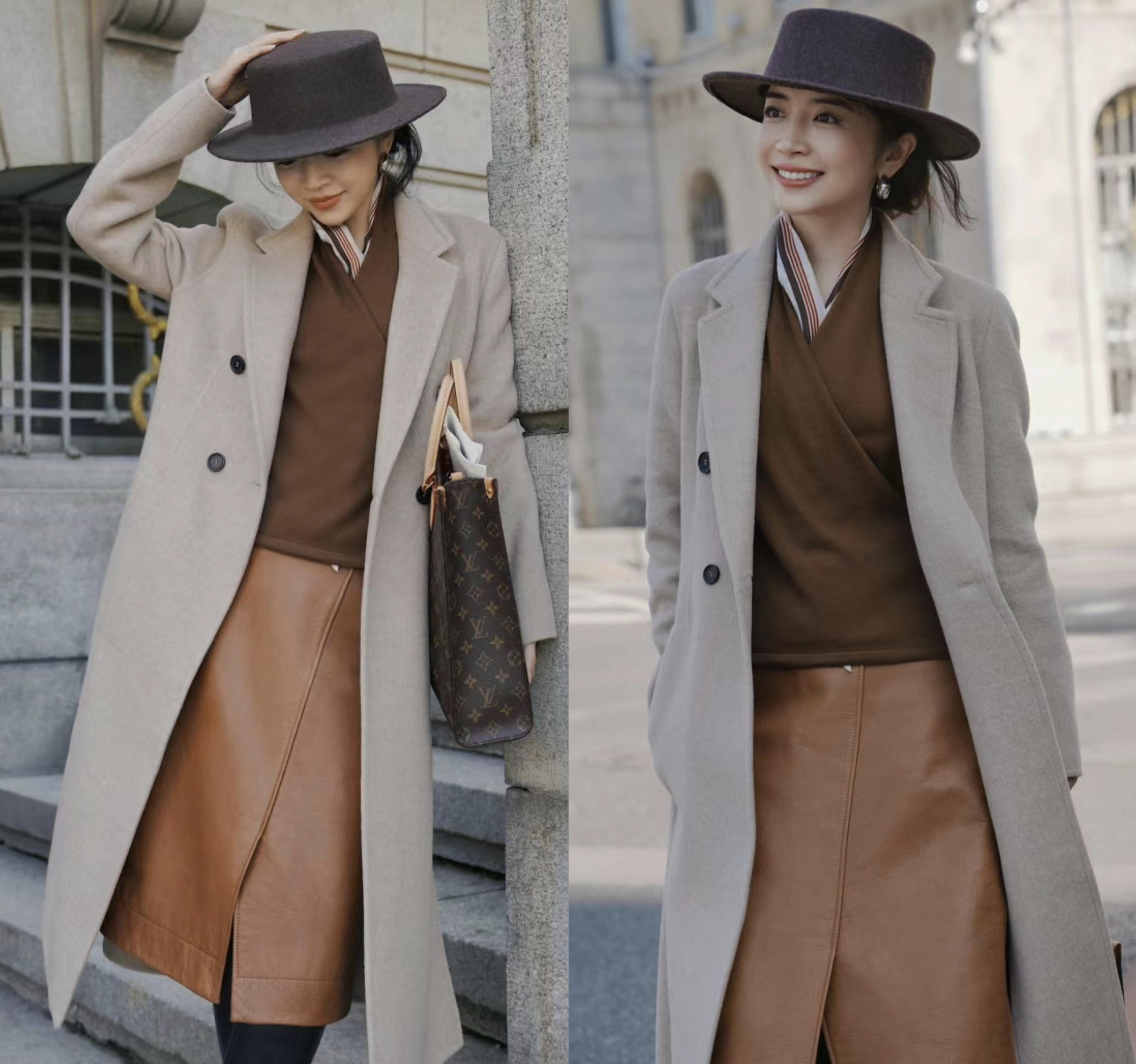 比如这套穿搭,运用到的就是皮裙和过膝长大衣的匹配,将会让摩登时髦洋气的感觉得以全面的体现,让女性的着装显得非常有品位。