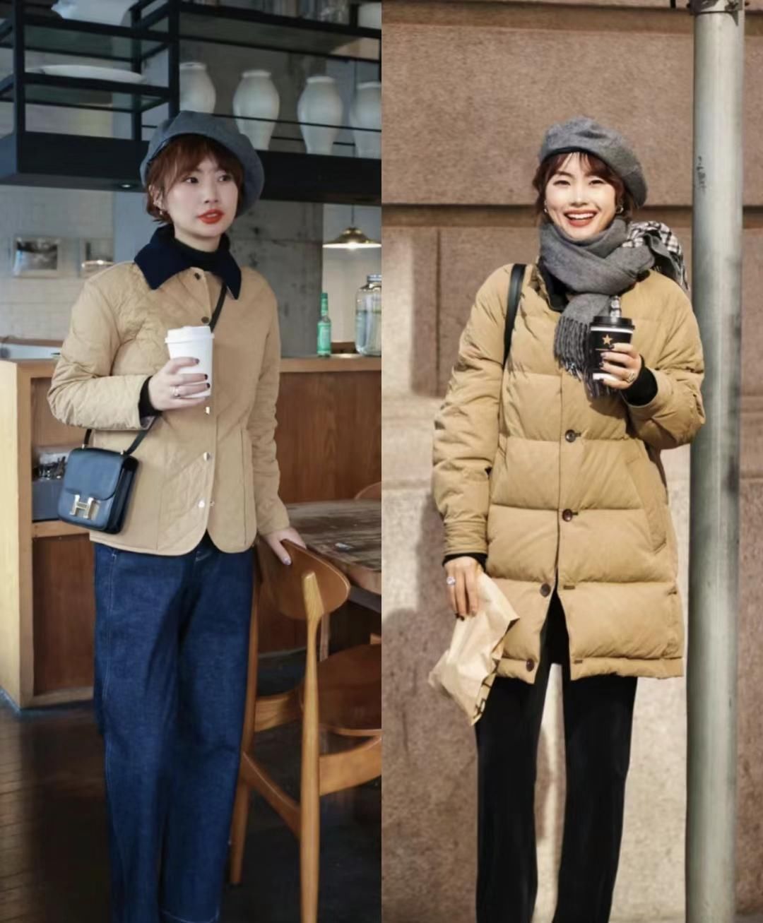 比如这件卡其色的长款羽绒服,它就会让女性的状态变得十分的温和,搭配黑色裤装,也不会沉重不堪。