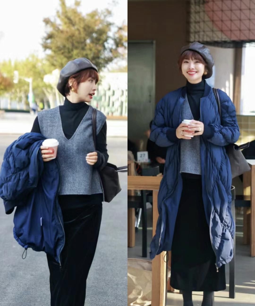 像这件蓝色的长款羽绒服,它就可以帮助女性构造出冷静而自持的形象,搭配半身裙,又有了稳重优雅的风采。
