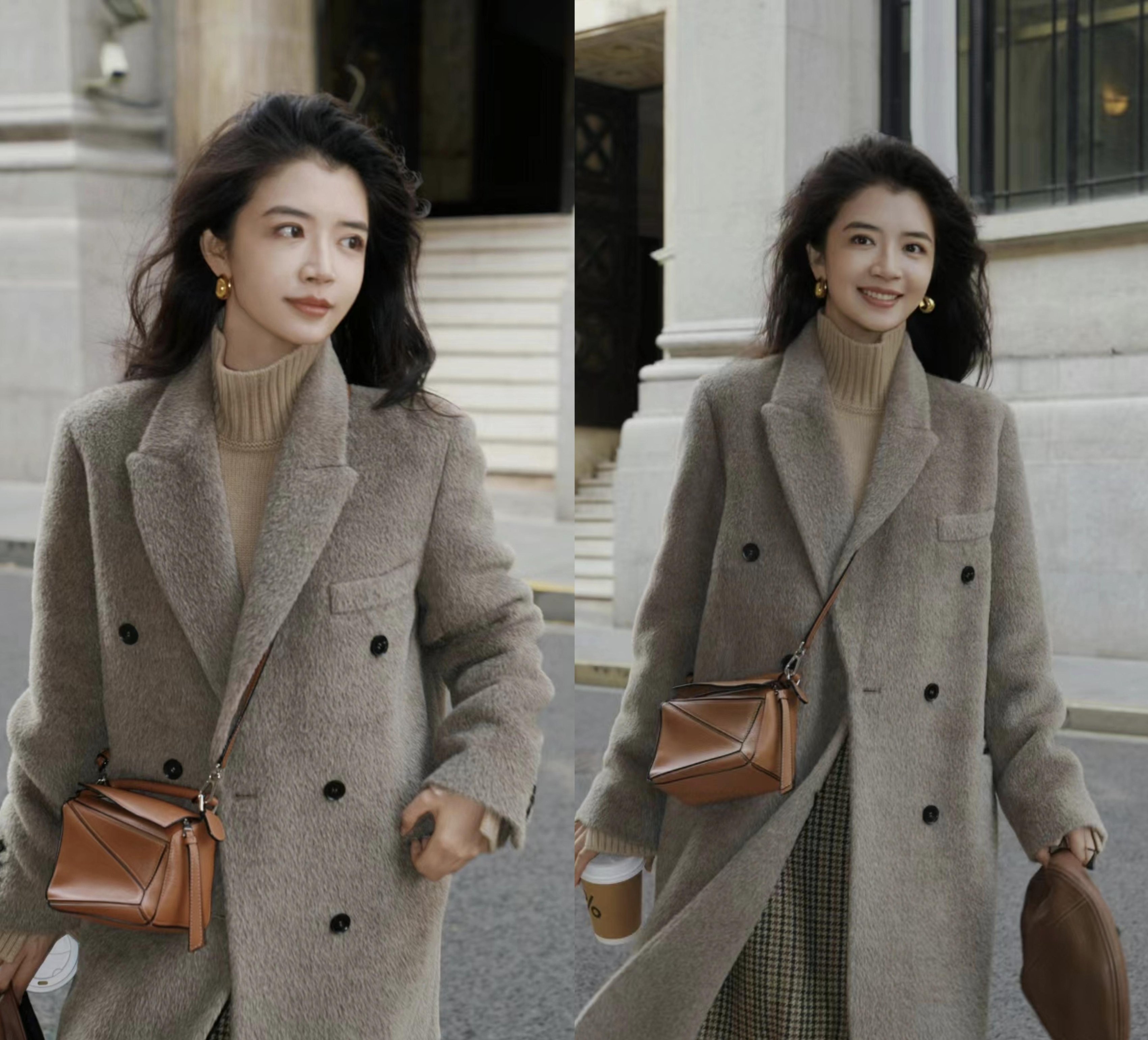 比如这件燕麦色的长款大衣,它也是今年比较流行的一抹色系,既能让女性展现出温柔的风格,又可以让她们具备高级的气息,在里面可以搭配大地色的毛衣,整体配色一目了然,不会太杂乱。
