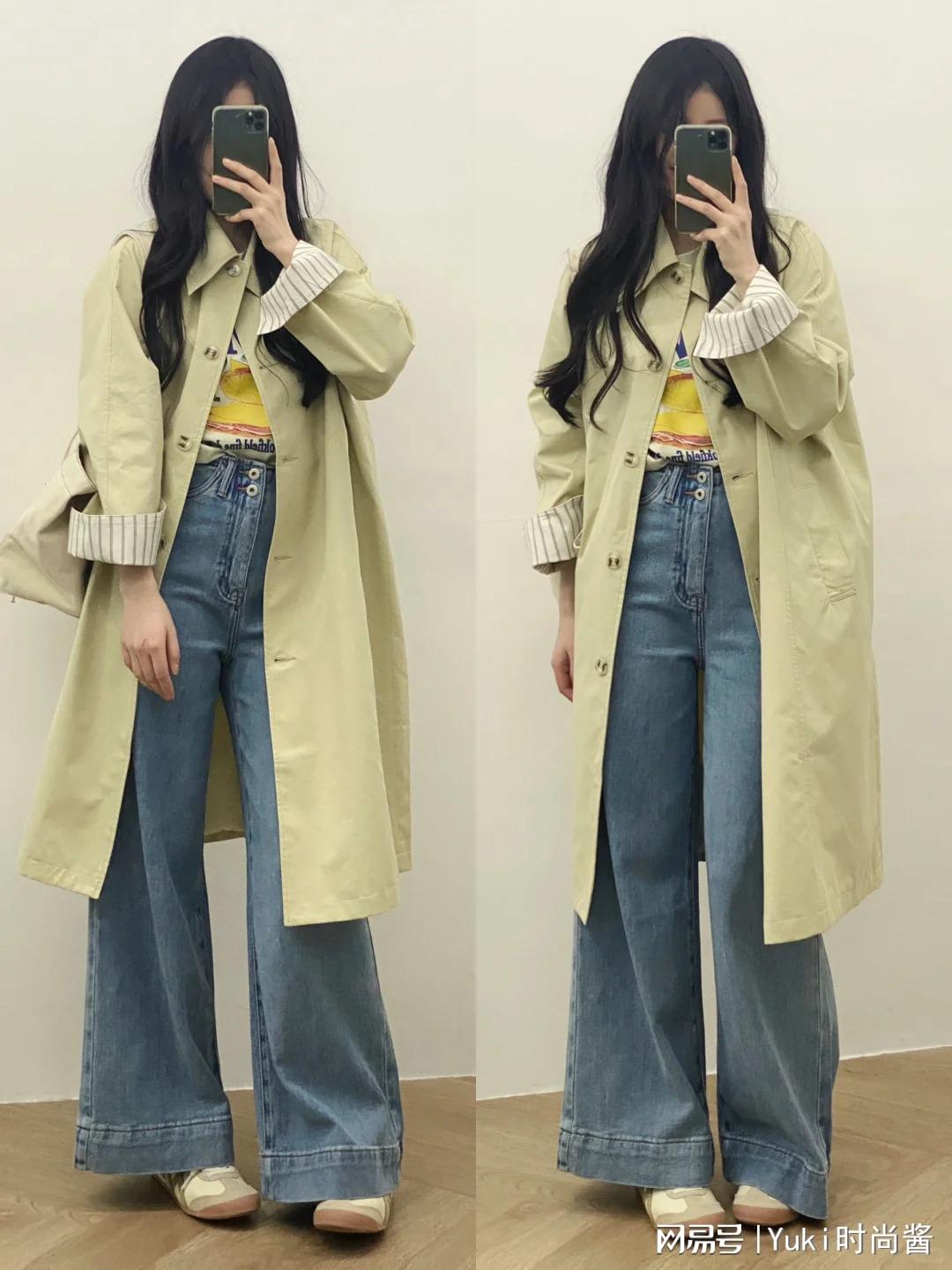 卡其绿长风衣敞开穿,内搭选择带有图案的T恤增添趣味感,下装选垂感较好的牛仔阔腿裤。德训鞋选择与风衣颜色相近的款,将内搭下摆塞进裤腰,凸显高腰线的同时,也更显完美身材比例。