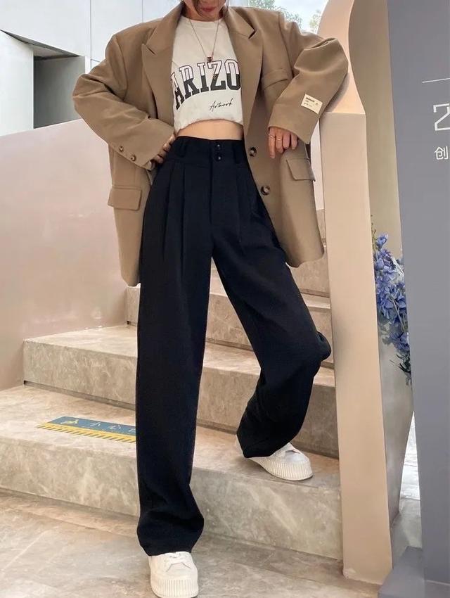 西装裤绝对是我秋冬的最爱了,同样是直筒阔腿版型,但西装裤的垂感要很多,O型腿和X型腿的姐妹们都给我去穿它,无论是正面还是侧面看都显得腿笔直笔直的。