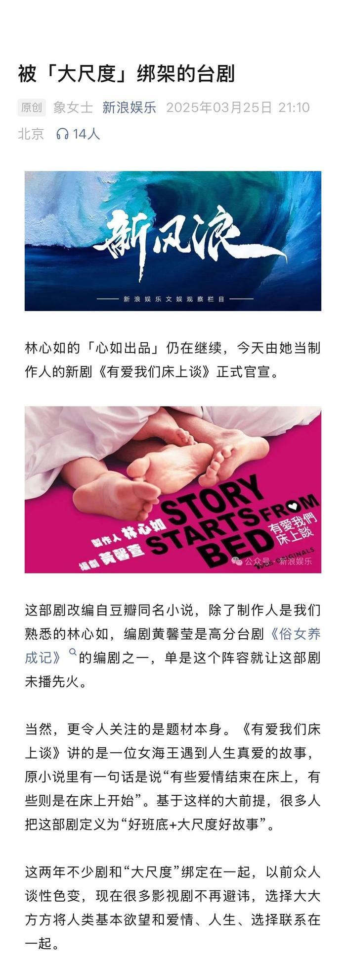 林心如的新剧《有爱我们床上谈》是根据豆瓣评分很高的同名小说改编的,小说中尺度很大,很多剧情都是从床上展开的。