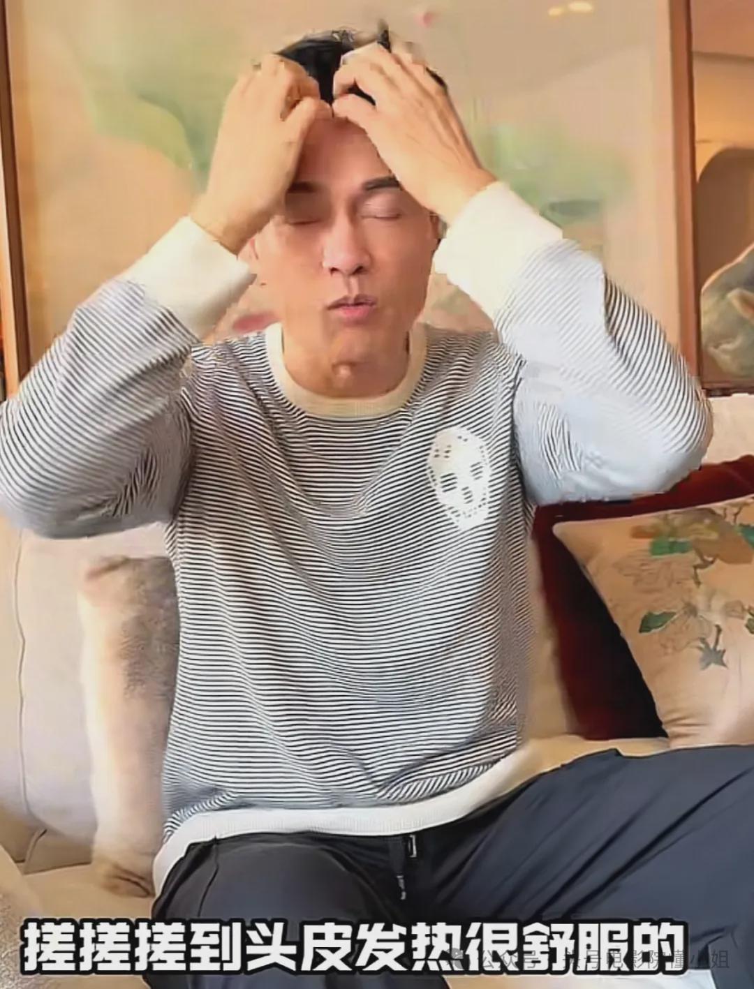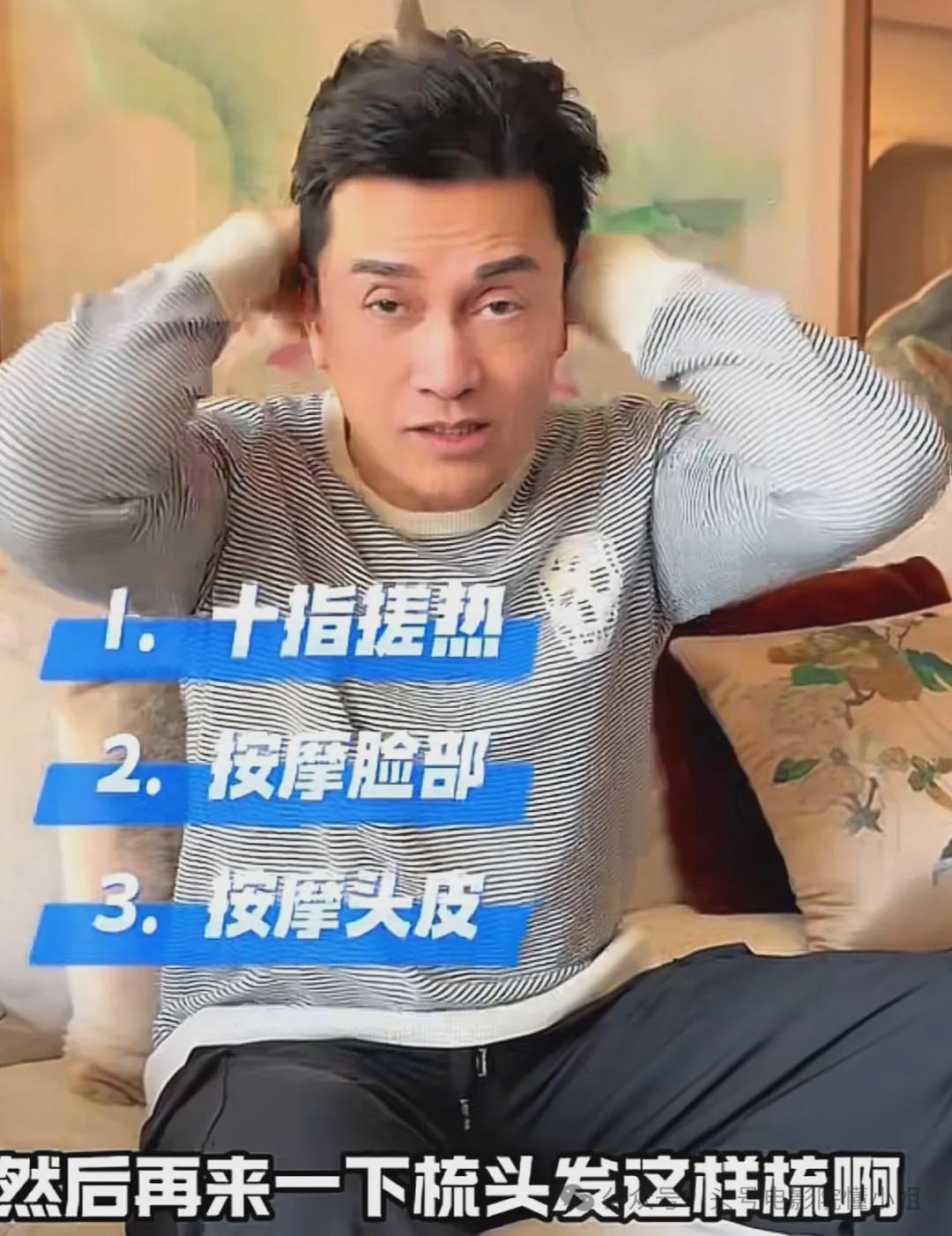 他说自己每天起床的时候,喜欢用10个手指搓热,然后就用搓热的手去按摩脸部,然后再用手去梳头发,按摩头皮。