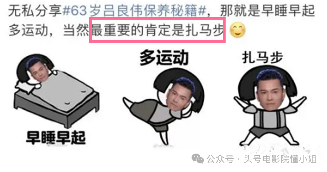 当时,吕良伟就毫不吝啬地在网上公开了自己的保养秘籍:早睡早起、多运动,还有一点很关键:扎马步。