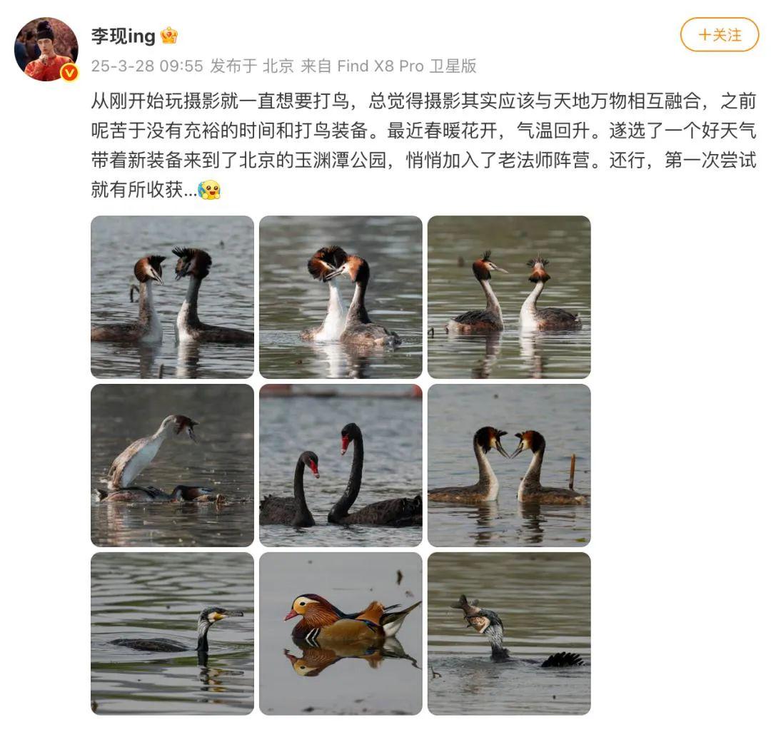 李现在个人社交账号发文称:“从刚开始玩摄影就一直想要打鸟,总觉得摄影其实应该与天地万物相互融合,之前呢苦于没有充裕的时间和打鸟装备。最近春暖花开,气温回升。遂选了一个好天气带着新装备来到了北京的玉渊潭公园,悄悄加入了老法师阵营。还行,第一次尝试就有所收获……”