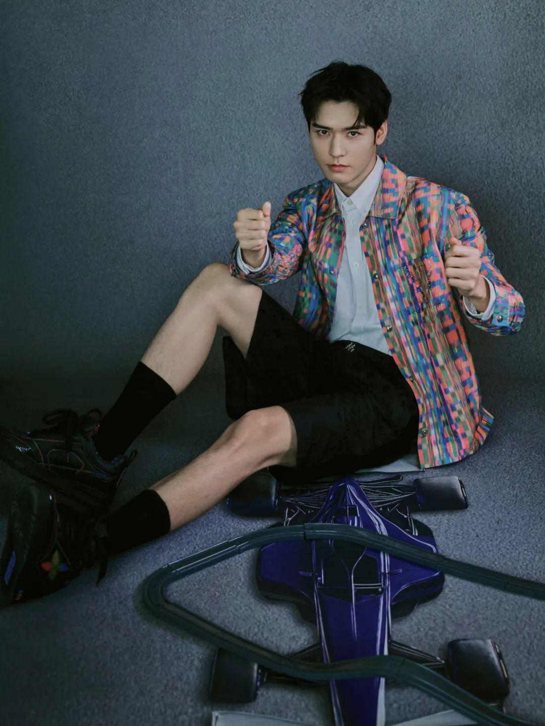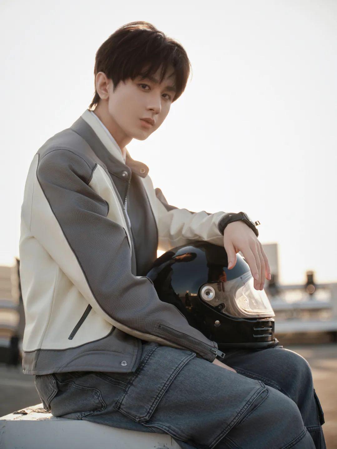 身穿灰白拼接皮衣和工装裤下的“赛车手”成毅尝试了与以往不同的造型风格,硬挺的皮衣面料塑造着他的硬汉形象。同时,同色系的色彩搭配,演绎出混搭却又适配的视觉感官体验。