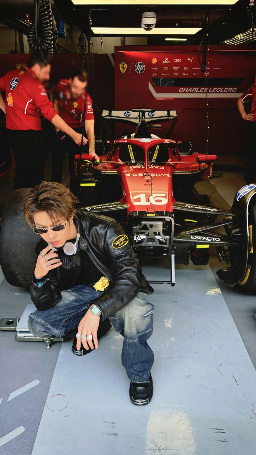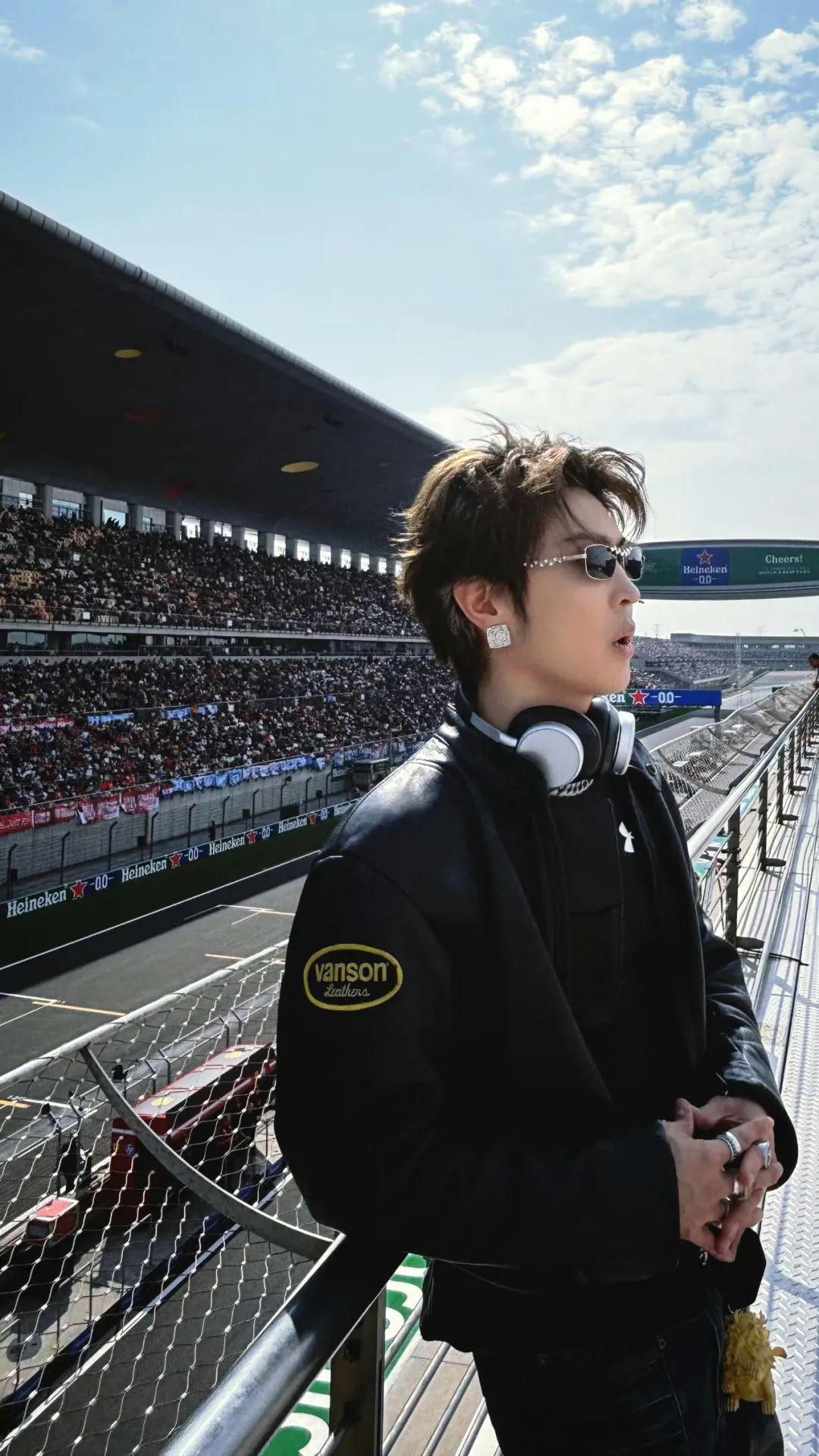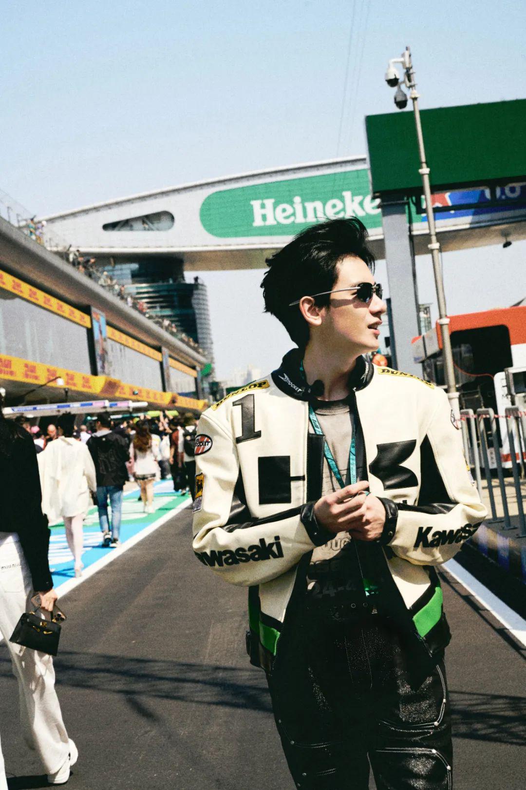 胡先煦走在 F1 大奖赛现场恍若“赛车手”,追求赛场上的速度与激情,感受比赛的魅力。他身穿 Vintage 印花机车服以及黑色皮裤,再打造经典复古的大背头造型、墨镜,与帅气拉风的街头“赛车手”身份十分契合。