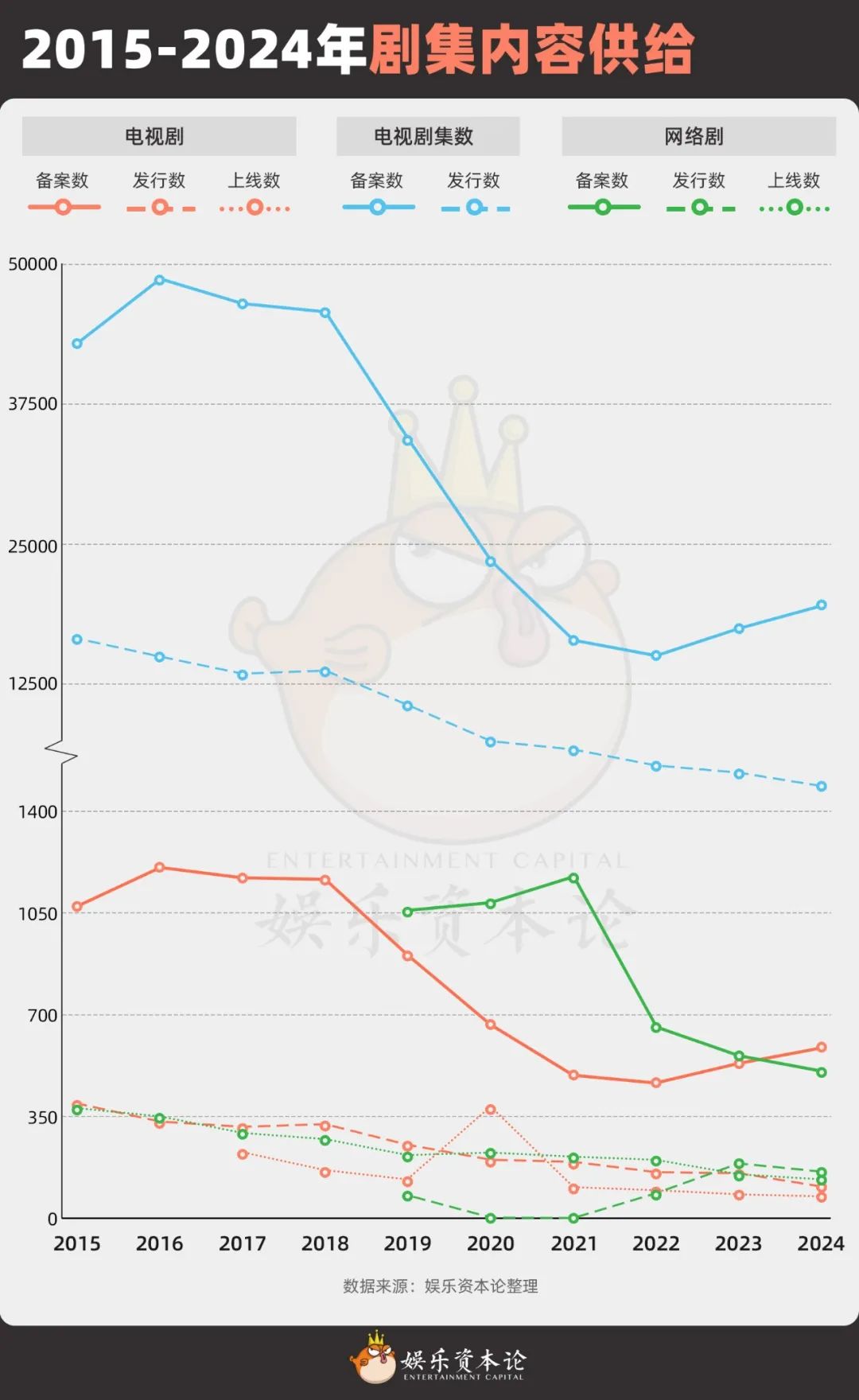 早年影视行业经历过一段疯狂的产能扩张期,无论是否有影视内容操盘经验的公司,都纷纷入局试图分一杯羹。热钱如潮水涌入,直接推动剧集产量暴增。2015年剧集发行总量一度飙至16540集的峰值,但市场消化能力早已触顶,大量项目因此陷入困境。