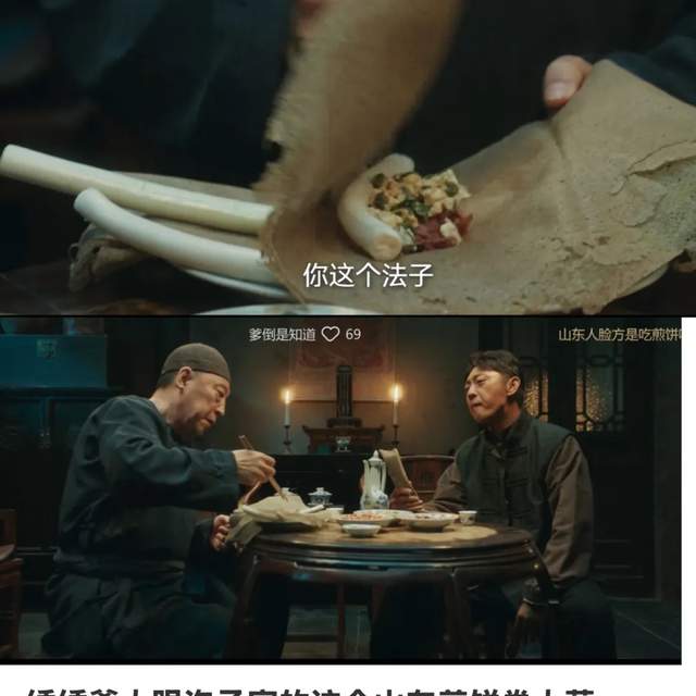 这从侧面说明的一件事,那就是对于山东人而言,煎饼是很重要的东西,婚丧嫁娶的场合都少不了它。那就更不要说,看剧中人怎么花式吃煎饼了。