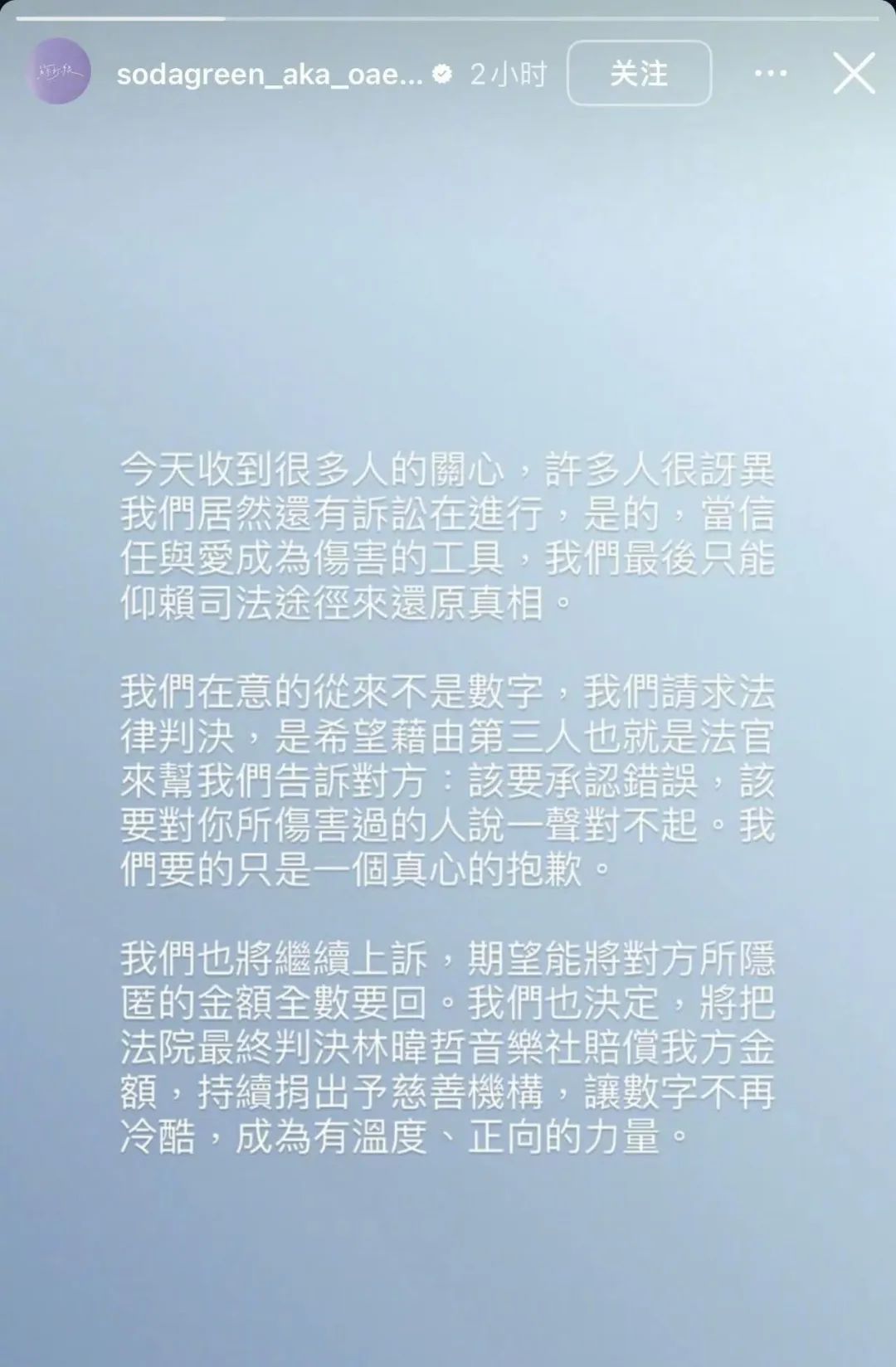 据台媒,苏打绿和前经纪人林暐哲恩怨未了,仍在打官司。今年6月,林暐哲一审被判赔偿2355万,他不服判决已提出上诉。据工作人员透露,林暐哲15年不断以高压霸凌苏打绿,给每个人都留下创伤后压力症候群;更导致青峰受失声所苦。对此,苏打绿20日在社媒喊话会继续上诉,“我们要的只是一个真心的抱歉。我们也将继续上诉,期望能将对方所隐匿的金额全数要回。”苏打绿也称将把法院最终判决林暐哲音乐社赔偿的金额持续捐出予慈善机构。