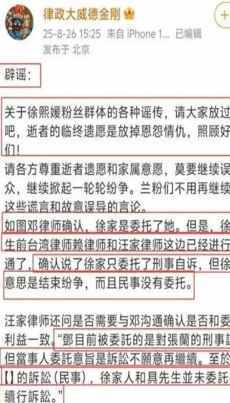 直接在微博发出声明,作为熙媛的代理律师,自己参与了案件审理。