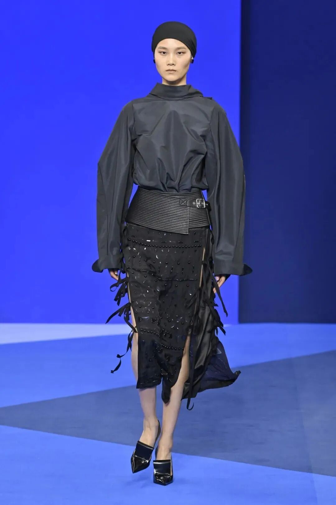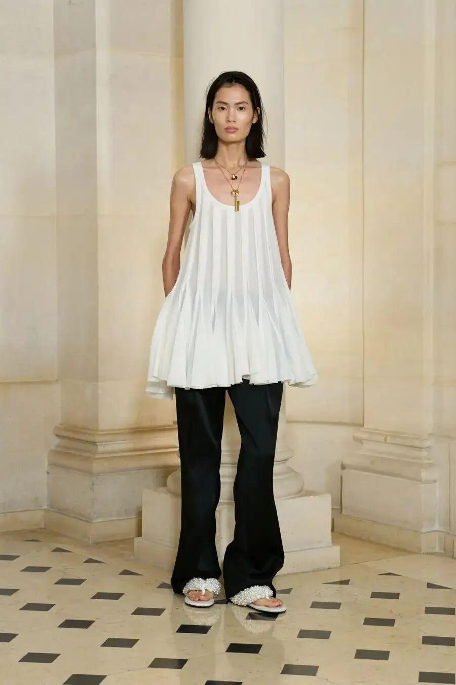 国内设计师RUOHAN本季以“须臾与节奏”为题,透过动作、色彩与韵律,唤醒被储藏的瞬间。蜡涂铜氨丝、透明棉纱、涂层亚麻,映照夏日光影;色彩如长调蓝天,从午后至黄昏。呈现了一首关于须臾与永恒的夏日乐章。
