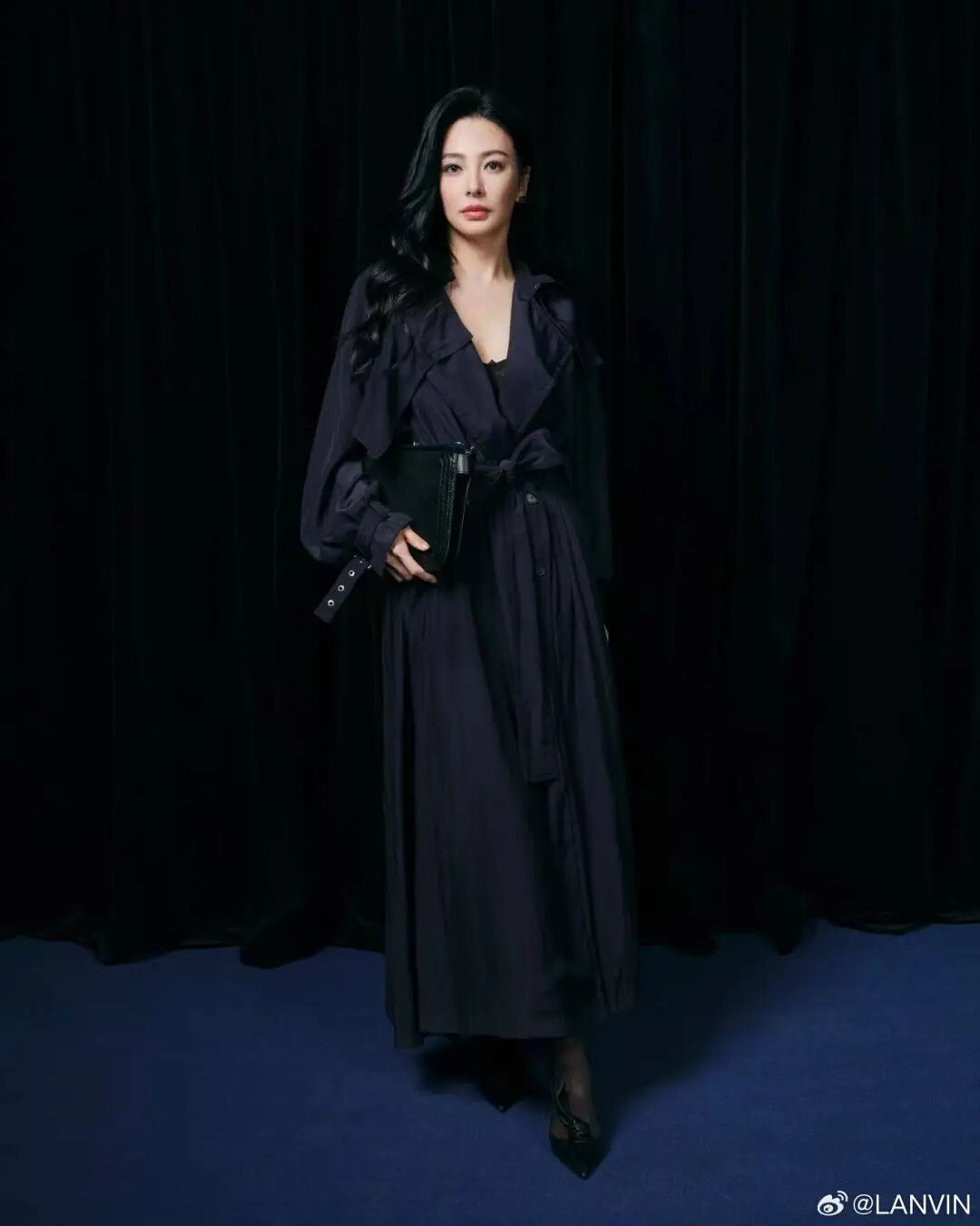 演员张雨绮身着LANVIN2025秋冬系列藏青色长款风衣,搭配Compagnon手袋、Midnight Step蝴蝶结高跟鞋出席本季时装秀。
