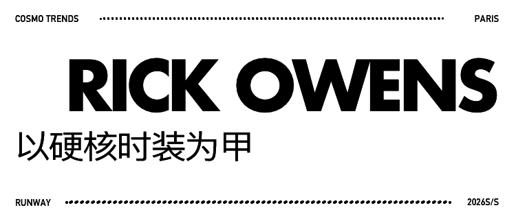 Rick Owens始终以时装回应当下的动荡:工业尼龙、橡胶、厚革与金属在此凝结成钢铁般的坚韧。灵感亦取自纽约朋克乐队Suicide的粗粝音效,将音乐的激烈情绪转译为皮革夹克的张力。最终,设计师以一场暗夜庙宇般的表演,呼唤穿着者以硬核时装为甲,抵御现实的荒凉,并在冷峻与浪漫的交锋中,寻得属于自己的“爱与延续”。