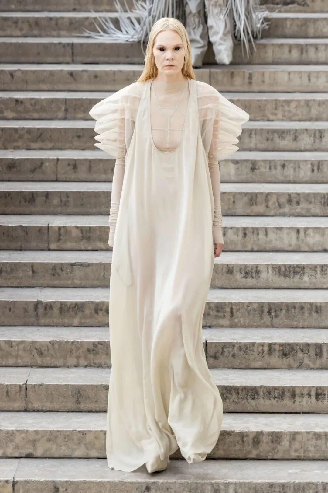 Rick Owens 2026 春夏女装系列以 “TEMPLE” 为名,与加列拉宫博物馆正在进行的回顾展“Temple of Love”相呼应。正如设计师所言,他始终试图用美国式的直白视角去诠释欧洲的美学积淀。本季依然延续这种文化交锋,将粗粝与华丽、克制与张扬并置,营造出一种带有宗教仪式感的戏剧氛围。