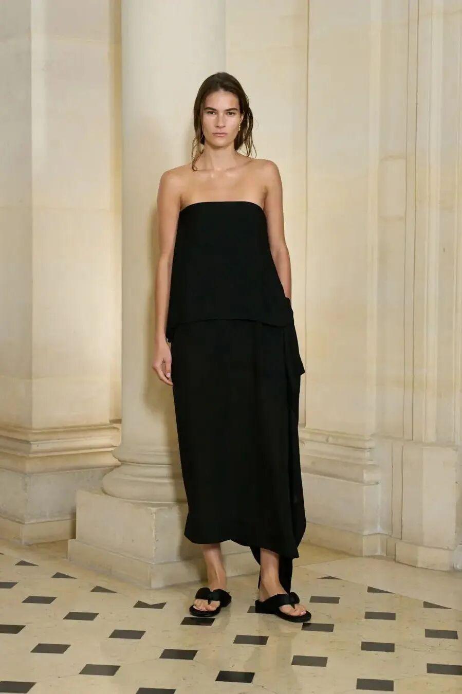 这是一次由目光点燃的对话——心之所向,彼此凝视,欲望在指尖轻轻游移。修长垂坠的轮廓勾勒出身体的流动曲线,开衩间肌肤的瞬间闪现,若隐若现的皮革胸衣,如欲望的呢喃低语。丝绸的柔滑、皮革的冷峻、羊绒的温润,在肌理交错间铺陈出感官盛宴。