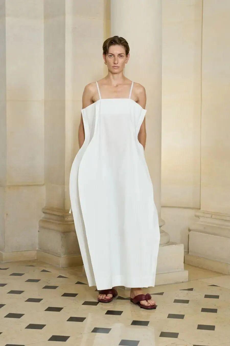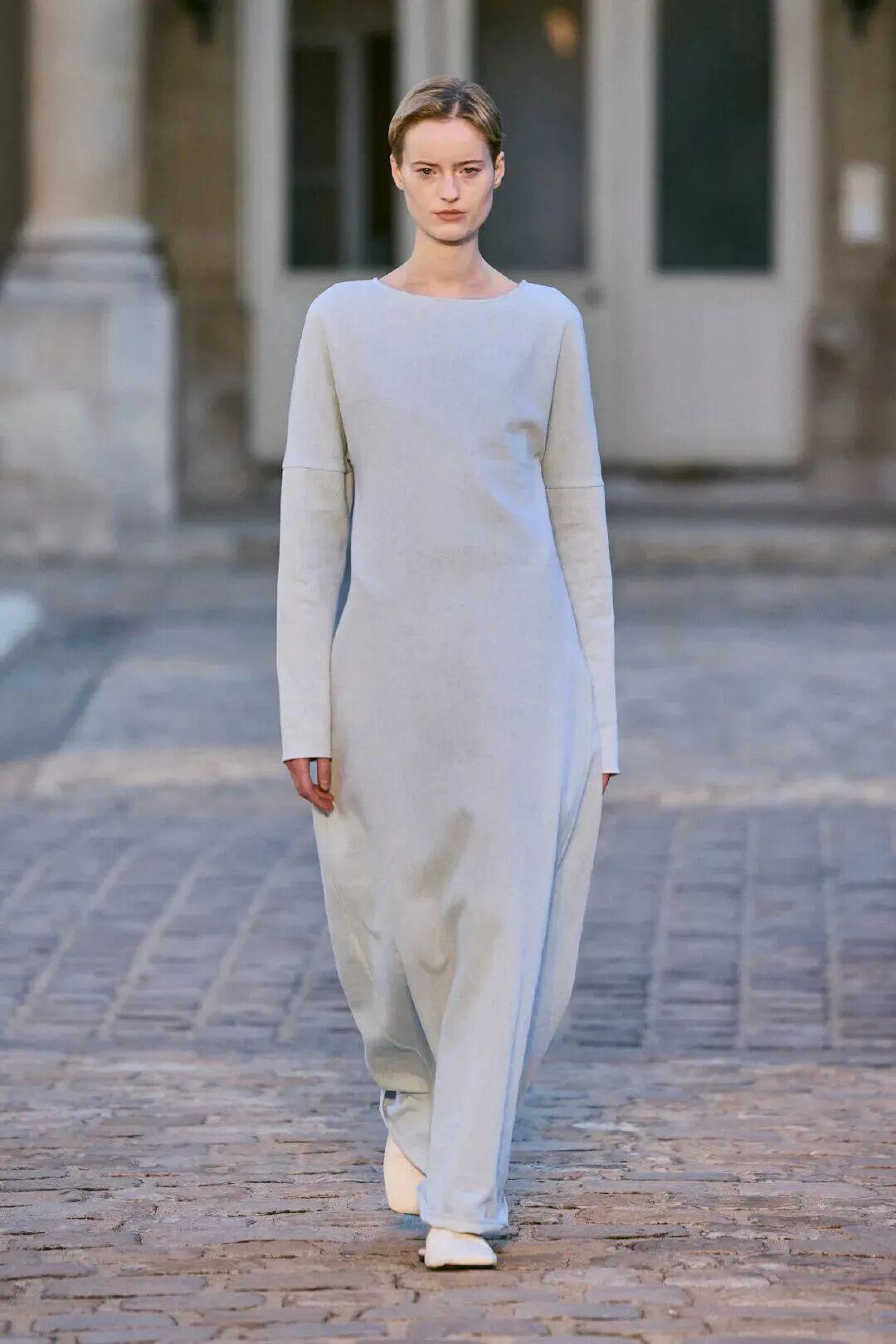 此次发布会选址品牌位于巴黎的总部,延续Trotter时期为Carven塑造的简约优雅基调。Thomas以更为克制的视角重新诠释Carven的现代语汇:清晰线条构筑出流畅轮廓,形与意浑然一体,展露低调而坚定的优雅。 色彩上以沉静为底,映衬肌肤的光泽与质感——从Carven夫人挚爱的兰花白,到烟黑与灰调的克制对比,再到浅米色的温柔平衡,构成静谧而富有张力的视觉秩序。蕾丝、内衣廓形、棉质纱、提花、真丝与波纹绸交织成章,延续法式工艺的柔美底蕴与永恒魅力。