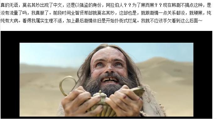这些阿拉伯反派在对女主角做坏事时,不仅用中文说出“要把女主买来喂牲畜”这种恶劣台词,还有“把小男孩丢出去喂狗”等极端情节。