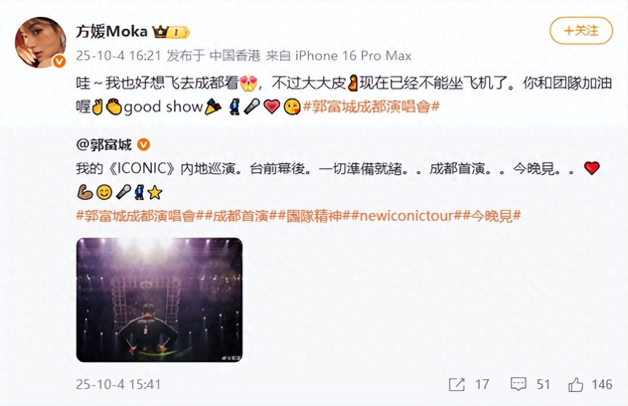 方媛发文称因为大肚子无法去看郭富城的演唱会。