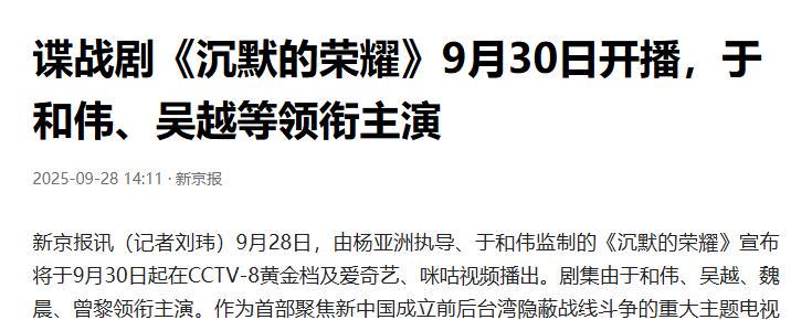9月30日,央八新推出了谍战剧《沉默的荣耀》,由于和伟和吴越主演。