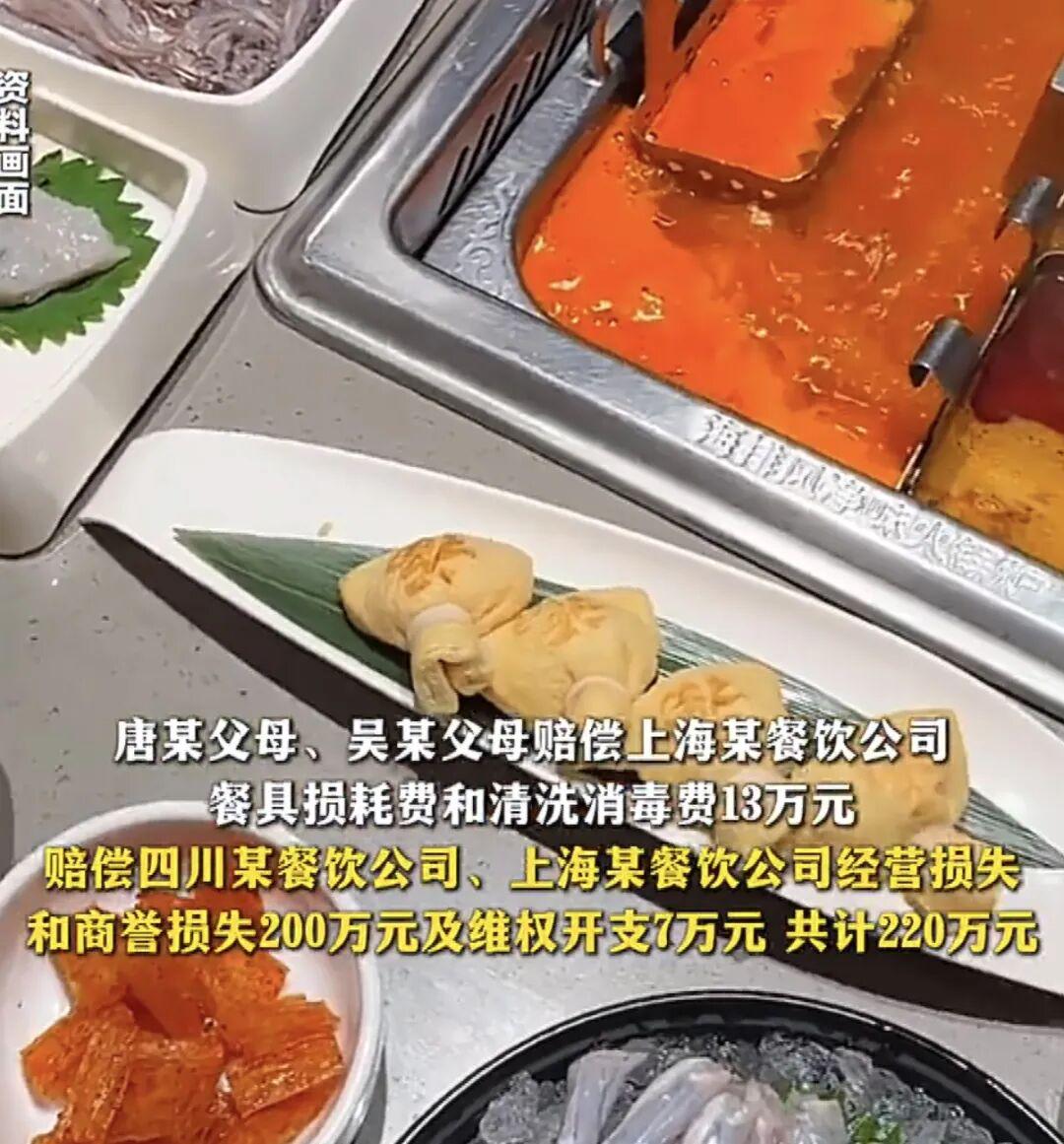 两名17岁男子往海底捞火锅里小便案有了新进展。10月9日,记者从最高人民法院获悉,人民法院判决唐某及其父母、吴某某及其父母分别在指定报刊上向海底捞赔礼道歉;双方父母赔偿海底捞餐具损耗费、清洗消毒费、经营损失、商誉损失等共计220万。目前该判决已生效。