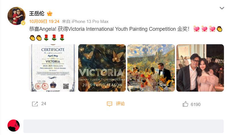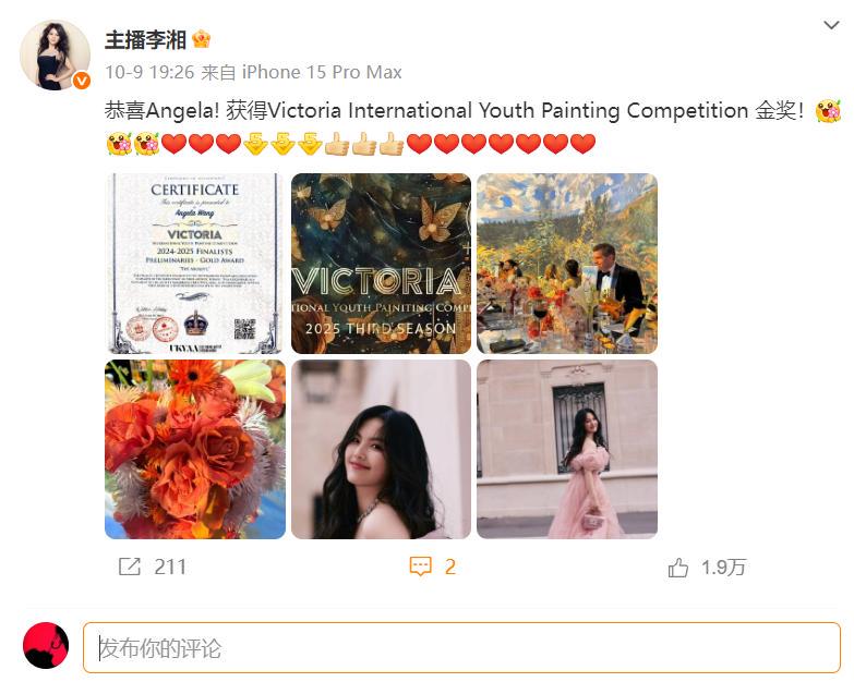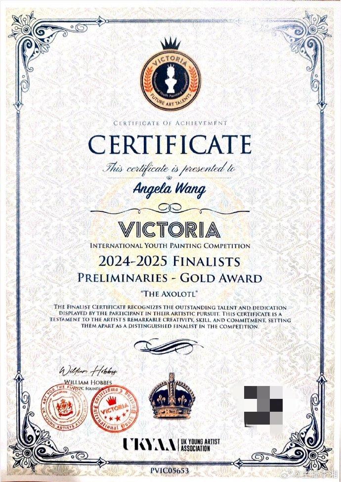 她发文恭喜女儿获得了维多利亚国际绘画金奖,并晒出了王诗龄的获奖证书和女儿的美照。