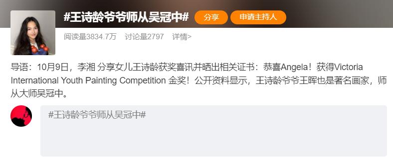 于是,王诗龄获国际绘画金奖和王诗龄爷爷师从吴冠中的消息都登上了热搜。