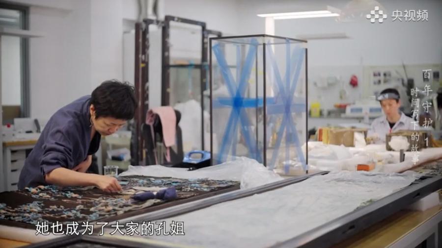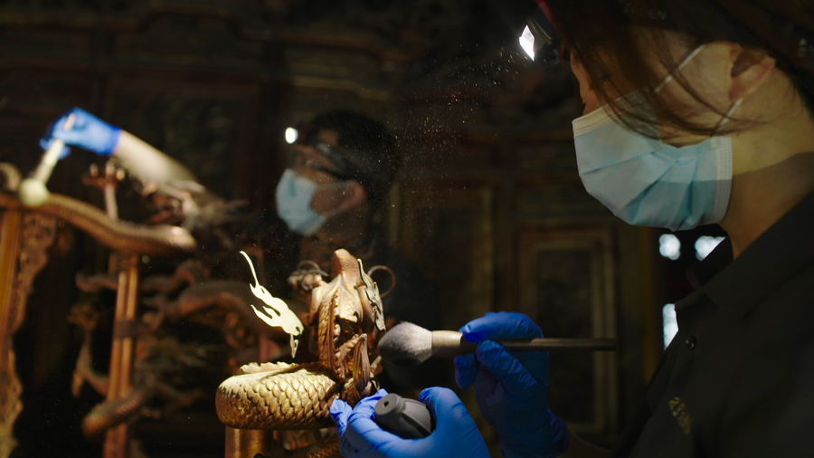 再看正片,伴随演员宋佳的解说,第一集《时间写下的故事》开讲,观众惊喜发现,太和殿前又见老友。2016年1月,纪录片《我在故宫修文物》播出,故宫博物院文物修复部的匠人们连同凝结在器物上的智慧、匠心,一并成为彼时顶流。近十年过去,许多观众熟悉的面孔已退休,却并未离开。《百年守护》的第一组“主角”就是文物修复的师徒:铜器组的王有亮、吕团结与徒弟们一起修复太和殿广场上的鎏金铜缸;钟表组的王津带着徒弟们将故宫修复技艺传播至西藏;书画组的徐建华曾跟随师父修过《清明上河图》等名画,半个多世纪后,他成了徒弟们的定海神针;在木器组,史连仓接父亲的衣钵已在故宫工作了40年,而今他和谢扬帆是师徒亦如父子;镶嵌组曾面临断代危机,是孔艳菊把队伍从最少时的两人发展壮大到了12人……