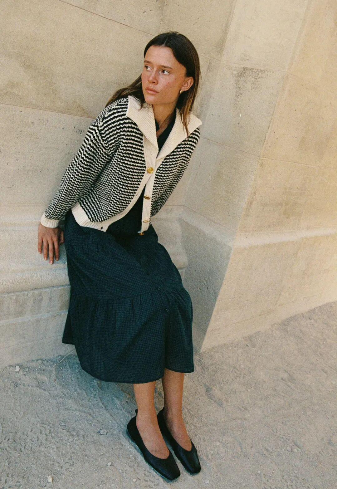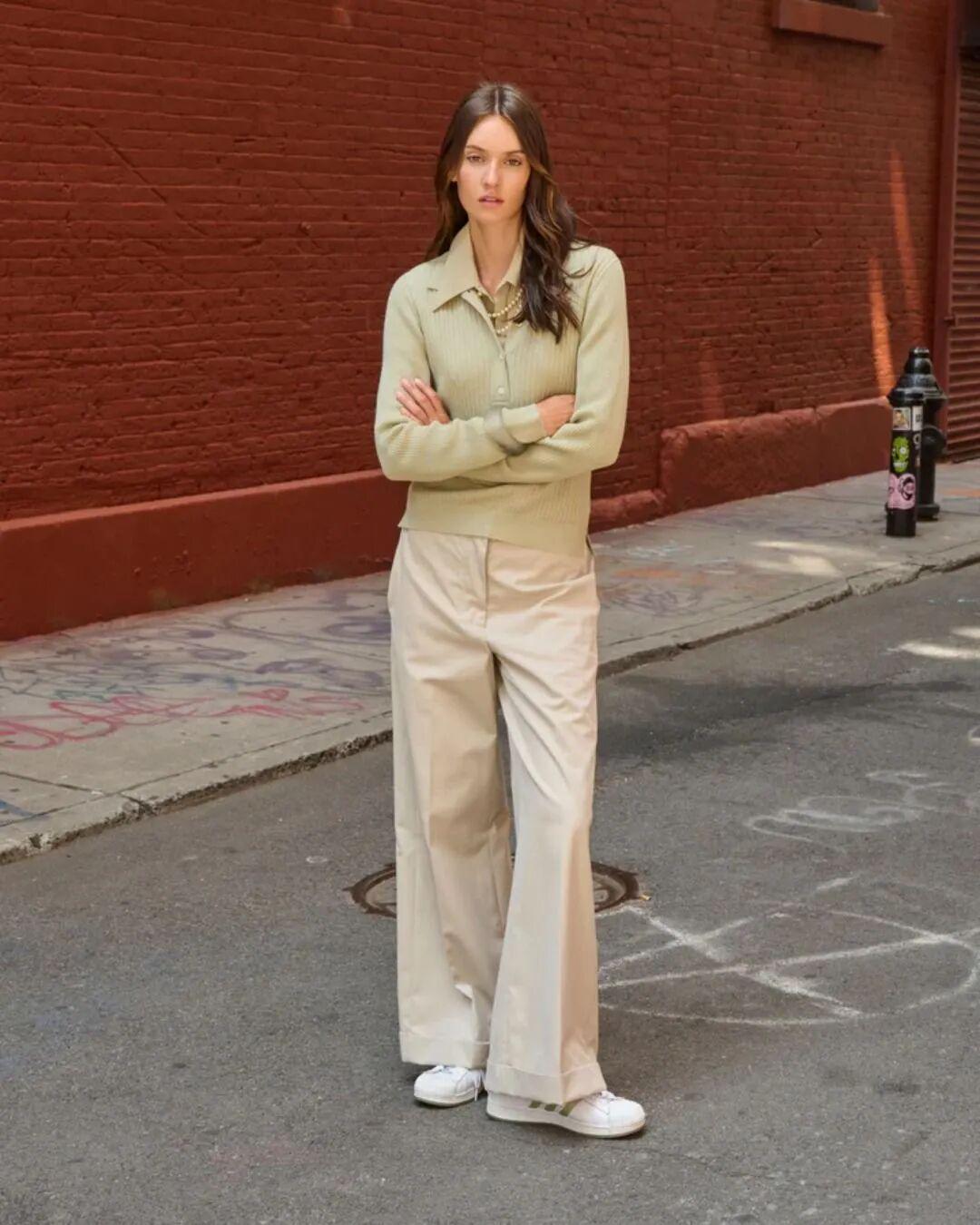 Polo式V领带有轻微的结构感。翻领在针织中被柔化,平衡了挺括与温和,让整件衣服更有轮廓感。