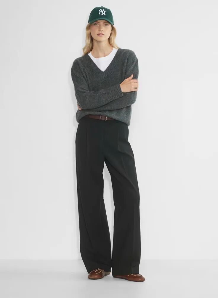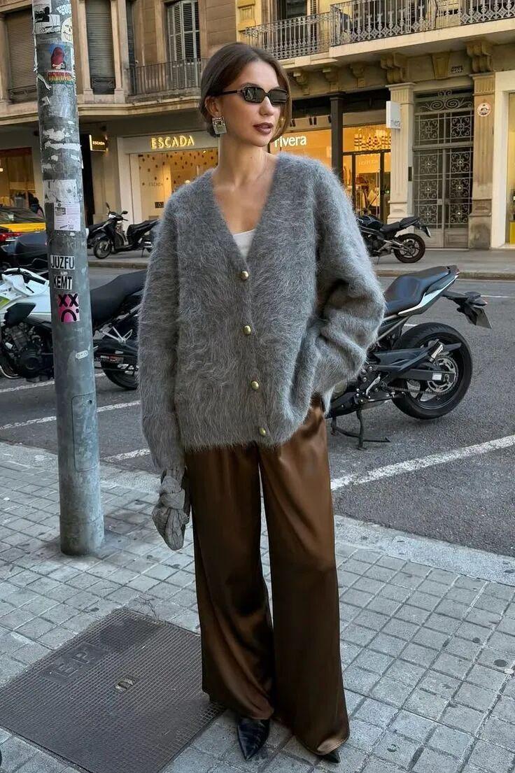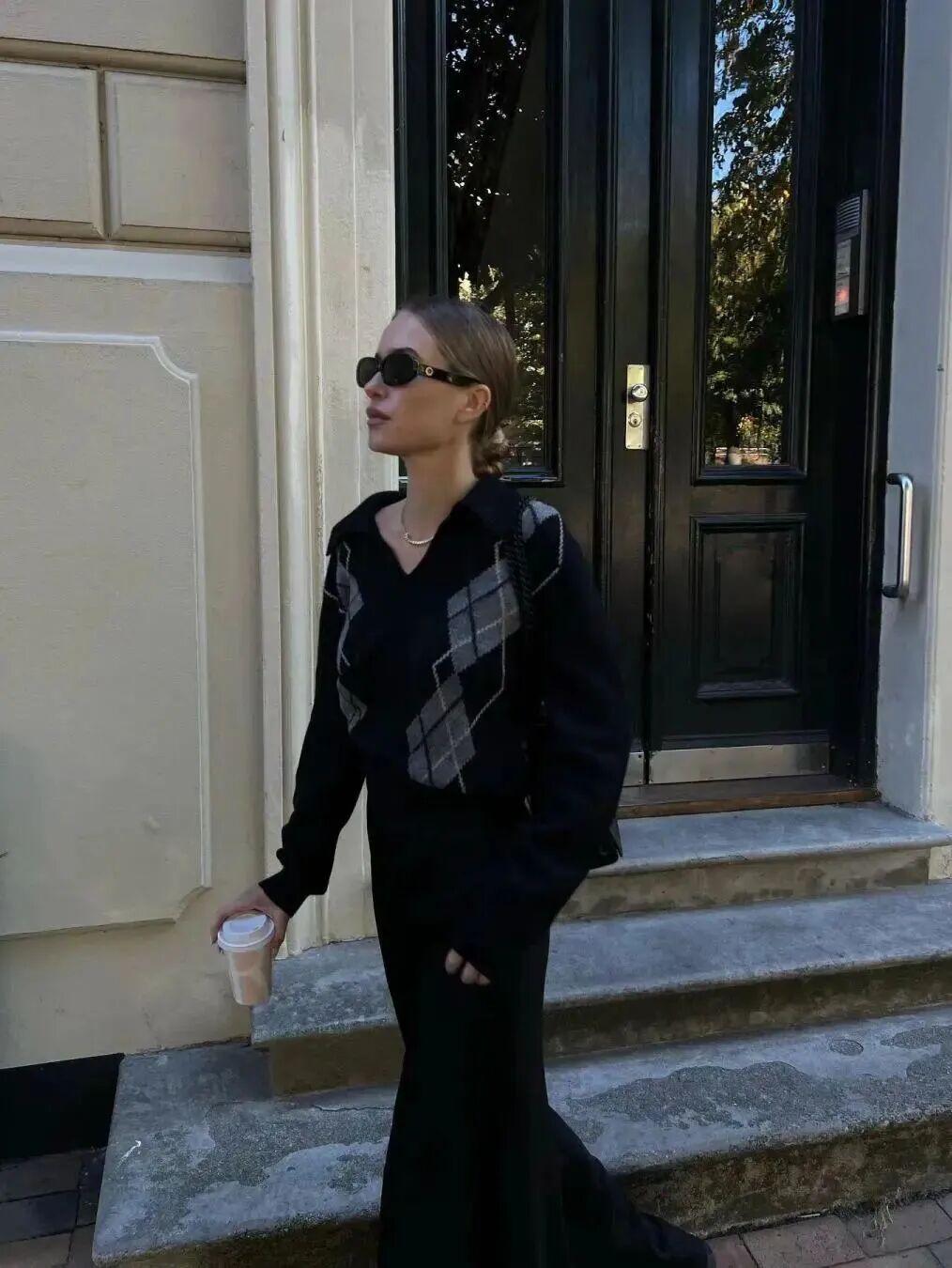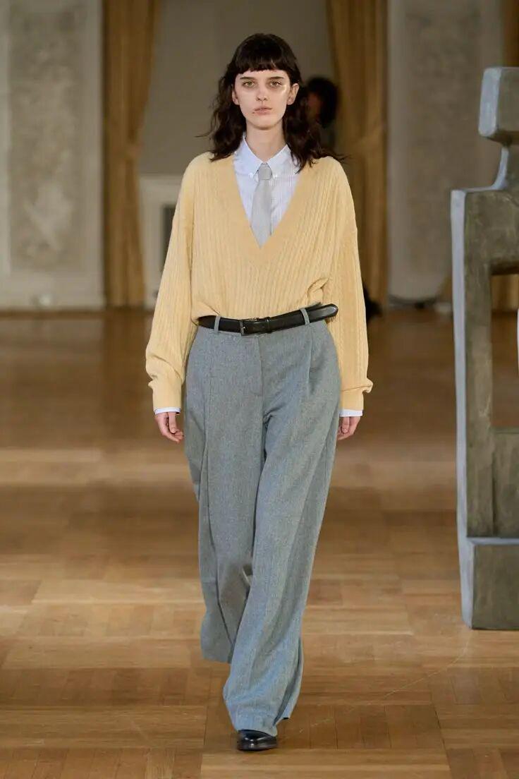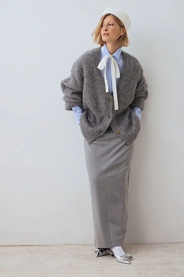 灰色是V领毛衣最能代表理性的色系。浅灰通透、深灰沉静,它们的存在感不强,却让整个造型更有力量。