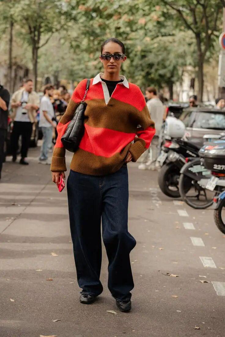 蓝色调削弱了毛衣的柔和,让整体更冷静;而条纹的线条与V形呼应,使造型更有层次。