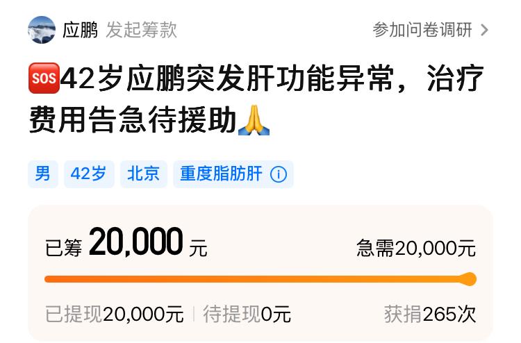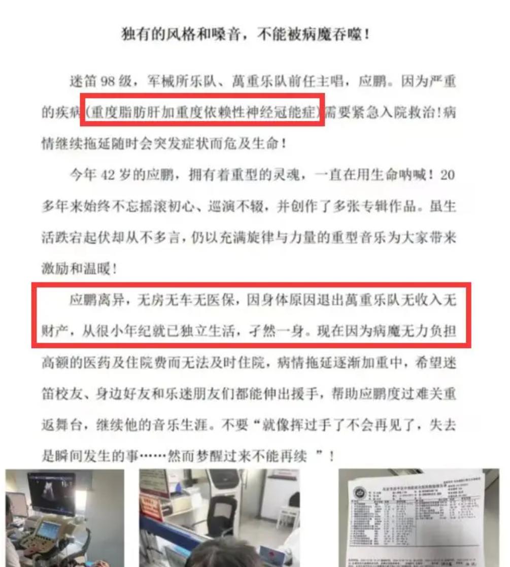 离开乐队后,为了治病,应鹏还曾在网络上筹款2万元。
