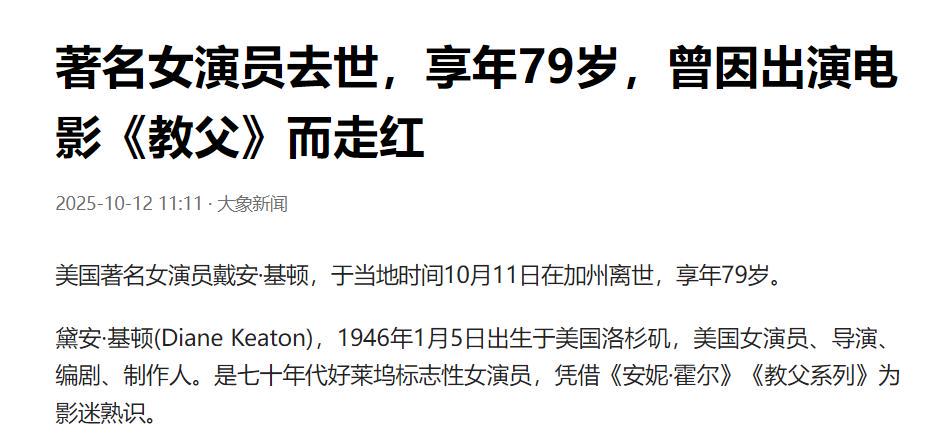 如今噩耗传来,据外媒报道,戴安·基顿已于当地时间10月11日在美国加州离世,享年79岁。