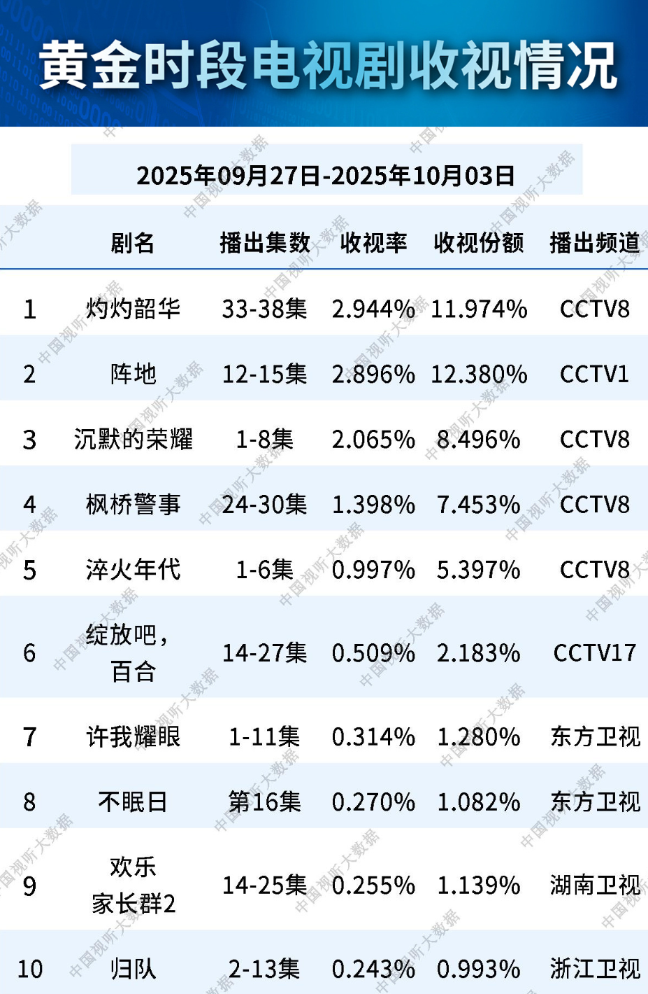 眼下总局公布了9月27日-10月3日黄金时段电视剧收视情况,究竟哪一部剧能够登顶榜首,我们一起来看——