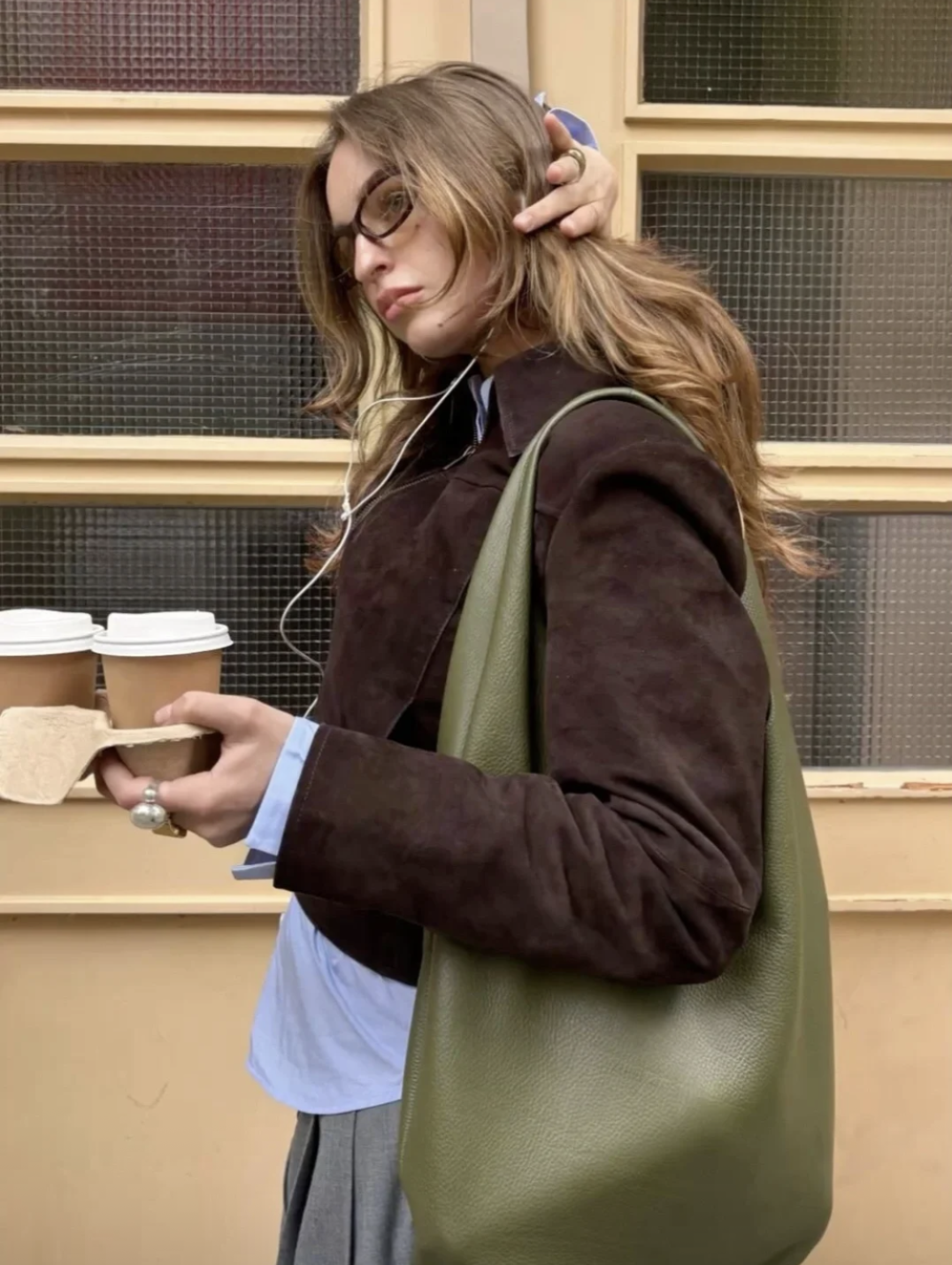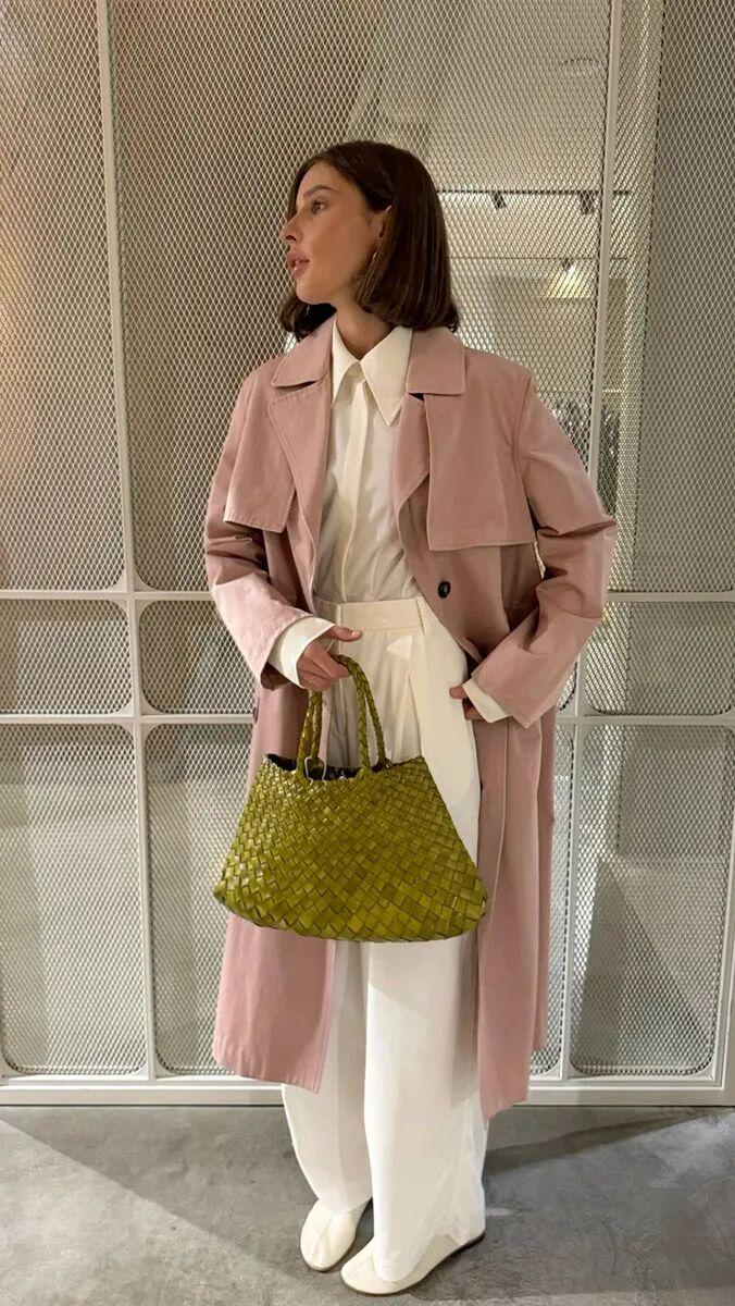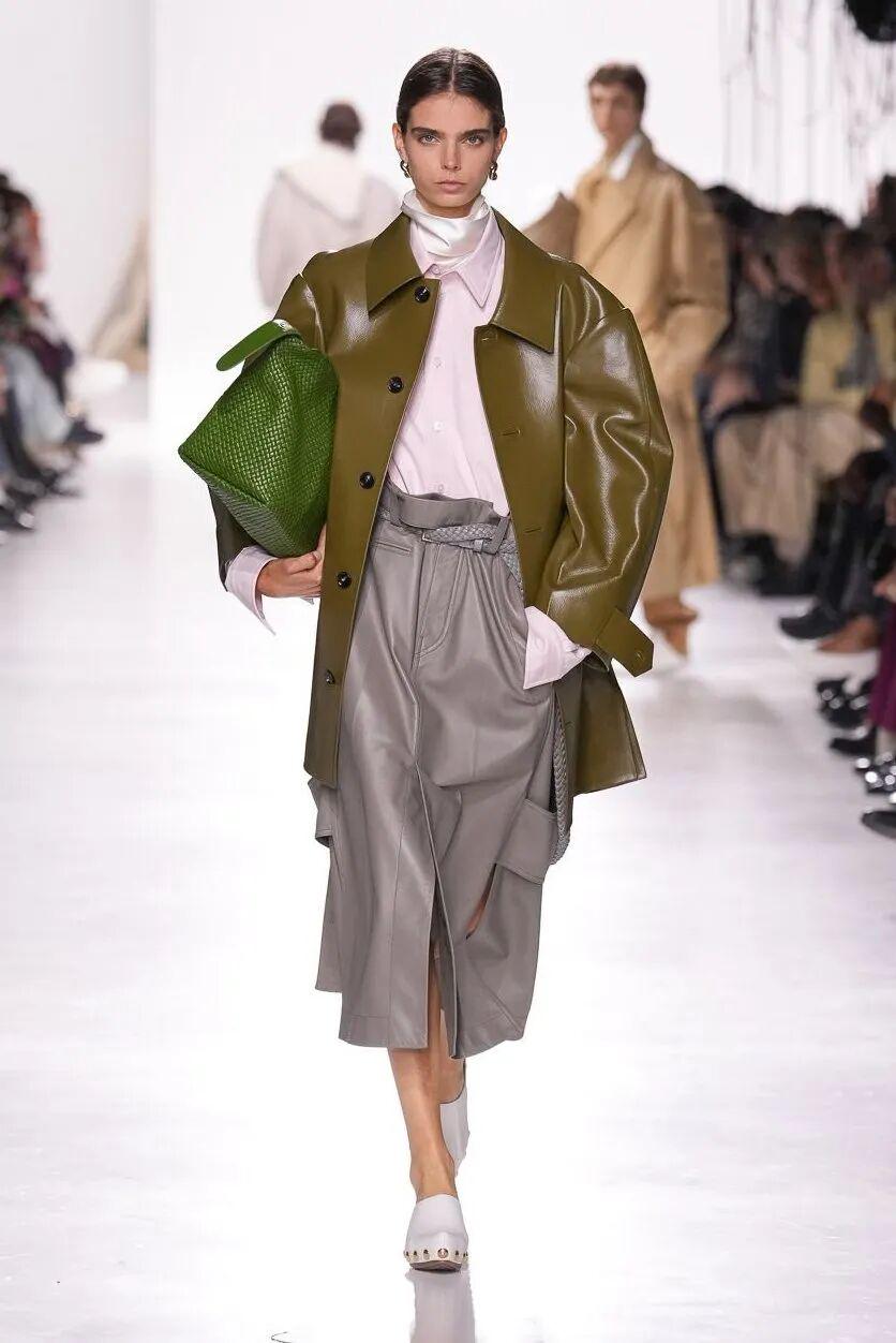 Bottega Veneta则用淡粉衬衫,搭配苔藓绿皮衣和草绿色包包,皮革元素让整身look更有质感(右)。▼