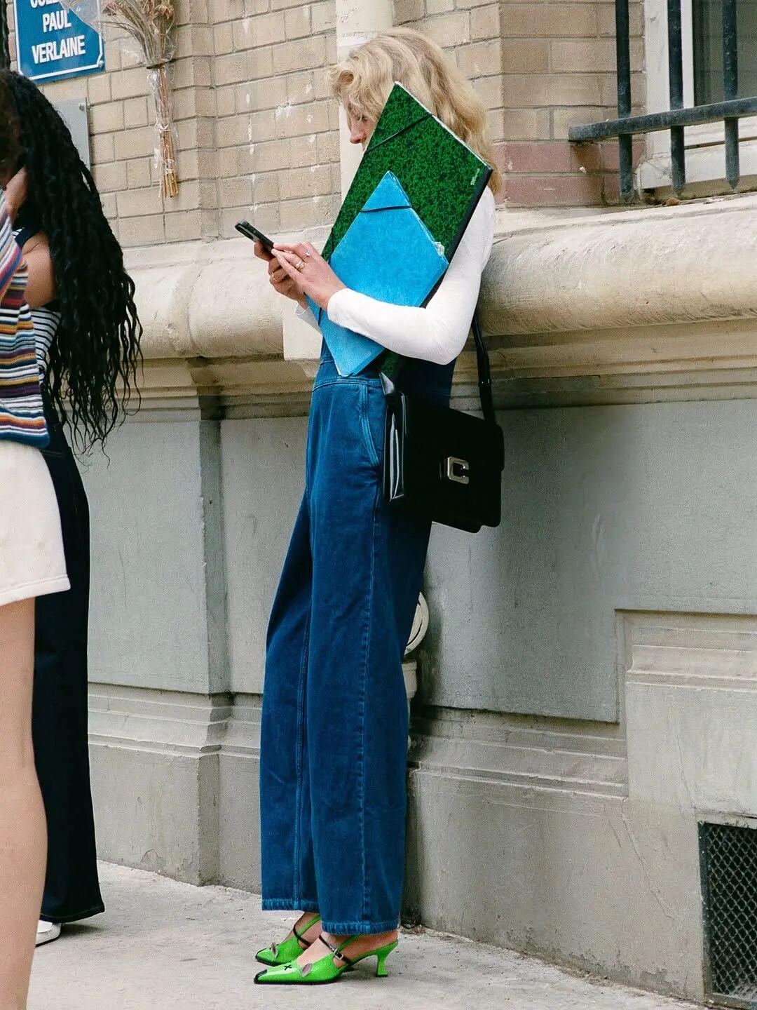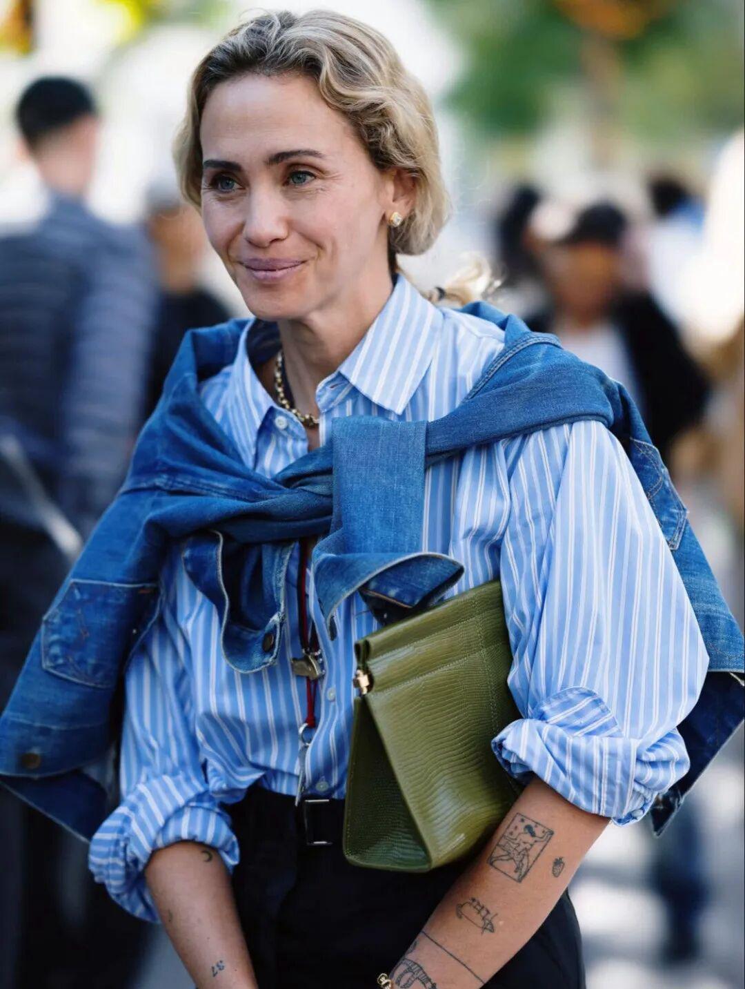 还有另外一组很容易复制的组合:蓝色衬衫+绿色包包。▼