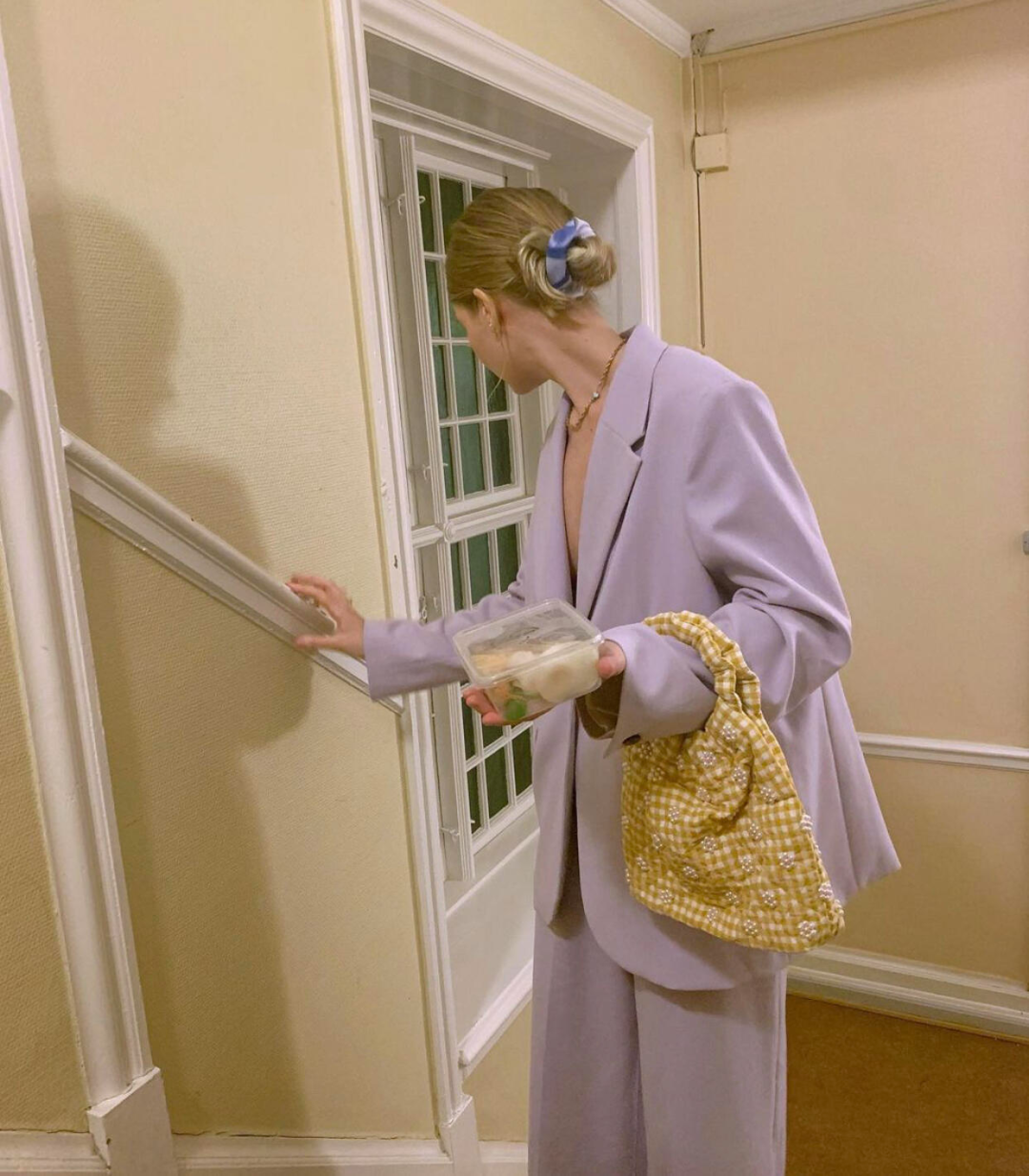 比如,浅紫/薰衣草+芥末黄格纹,降低了整体的饱和度,既清新又显白。▼