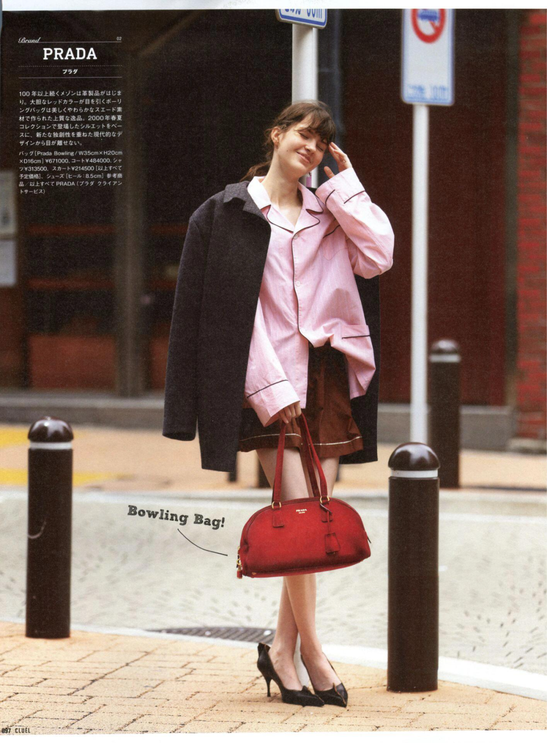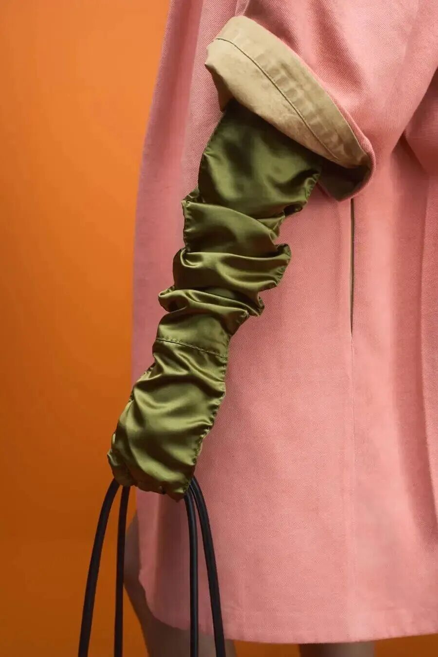 Prada的桃粉色大衣,搭配抹茶绿手套,好有活力。▼