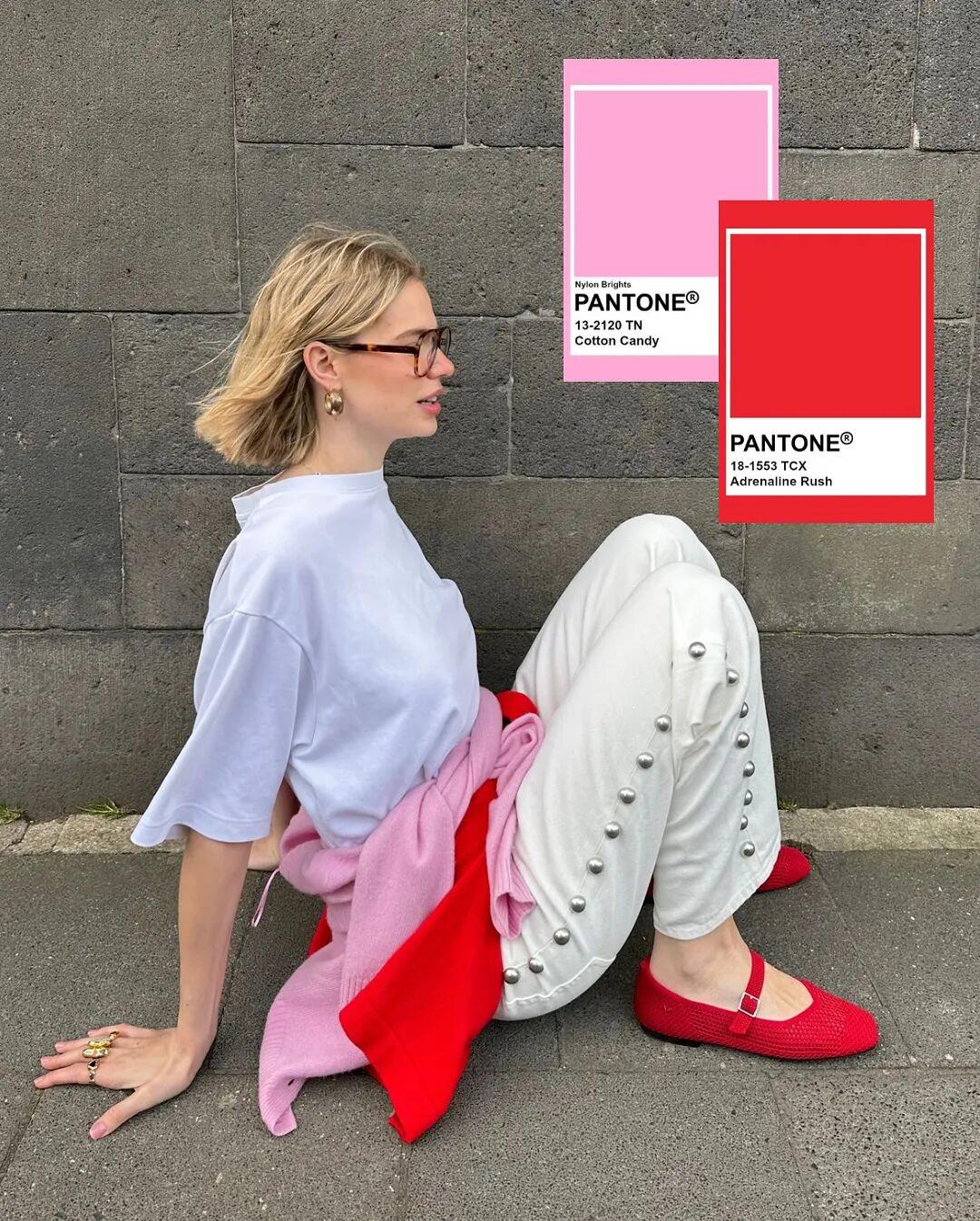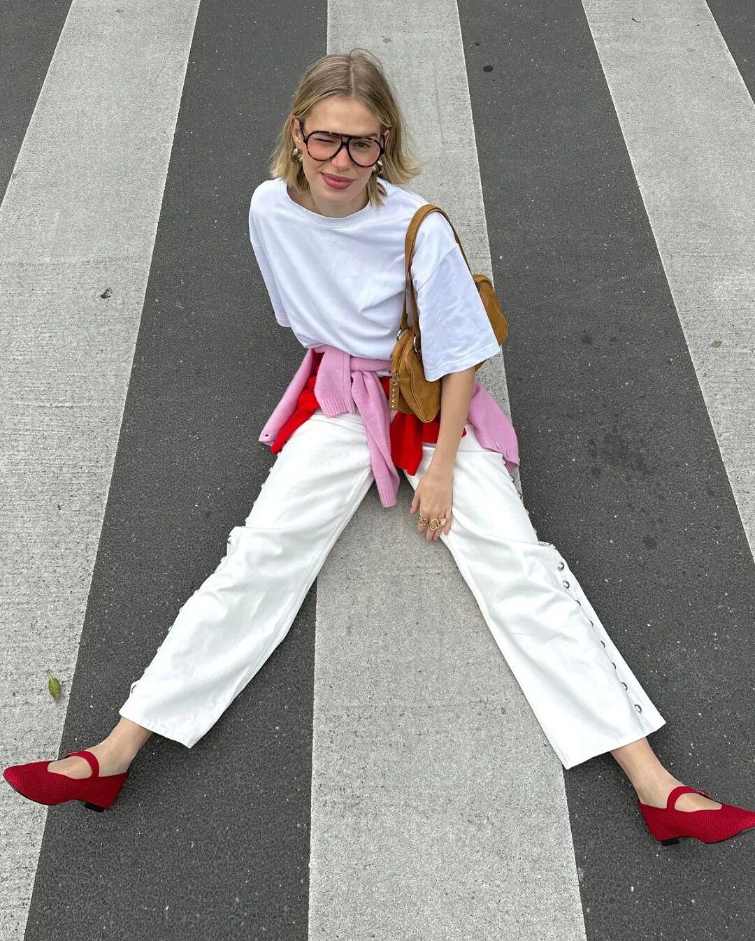 如果想把“红+粉”穿得更有呼吸感,可以试试像德国博主 Linda.sza一样,加入“万能打底王”——白色。▼